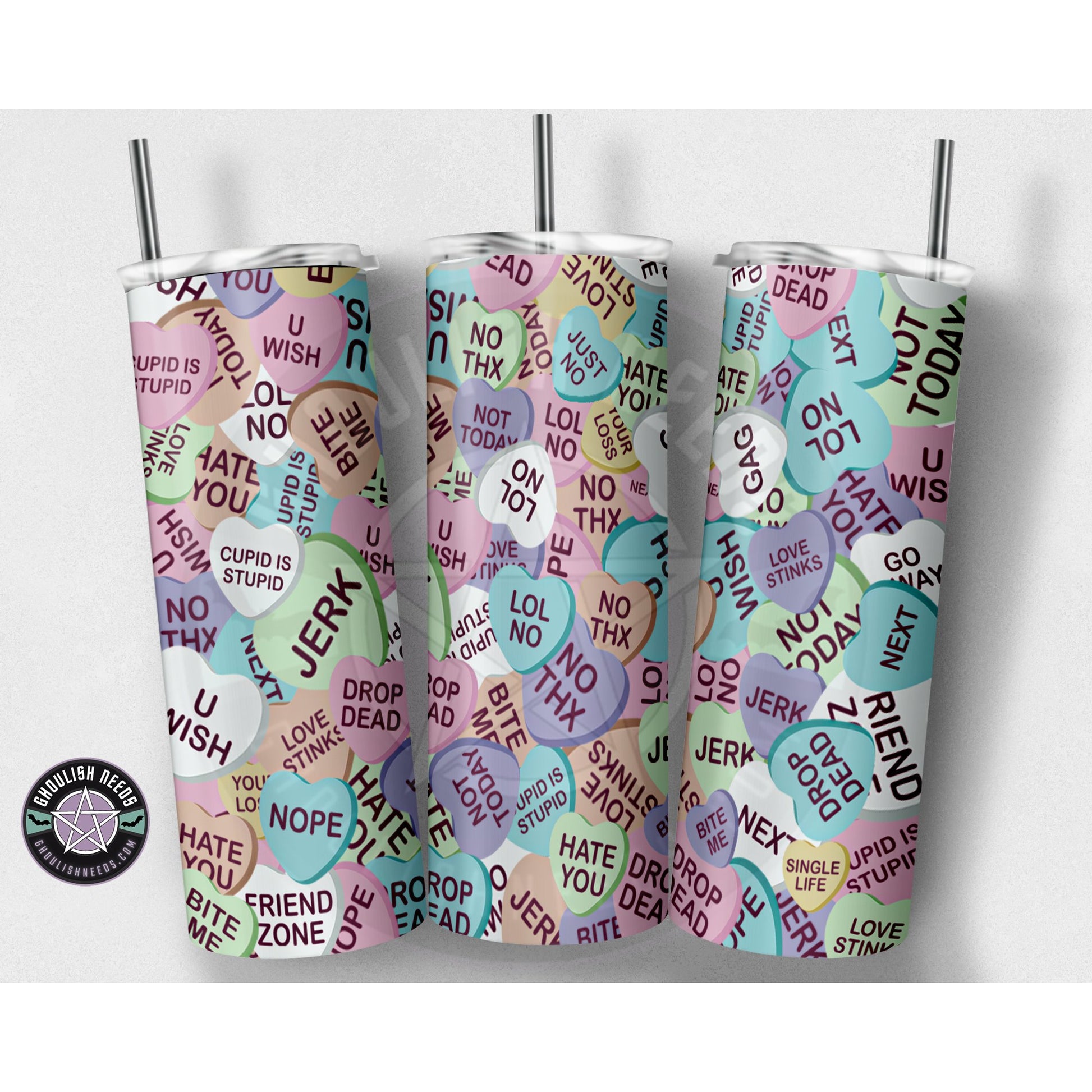 This Anti Valentines 20oz Tumbler is handmade by a small business and features anti Valentines candy hearts. Its double insulation ensures your beverage stays hot or cold longer. Enjoy your favorite drinks with this unique tumbler.