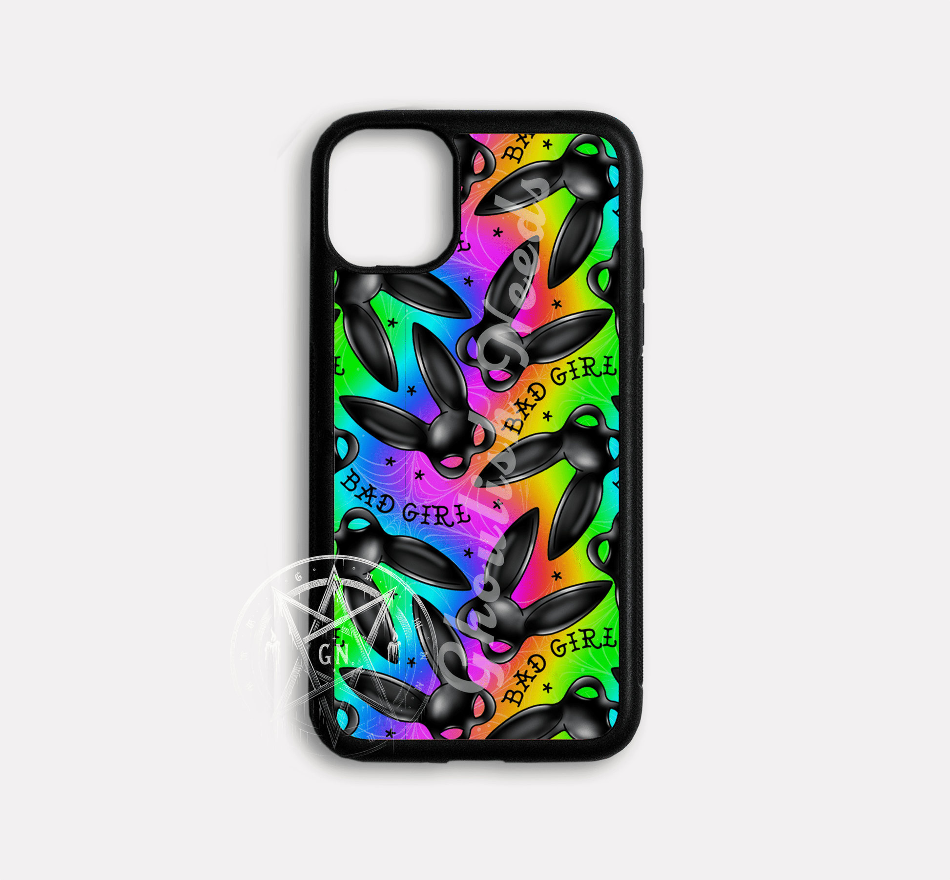Make a bold statement with this Bad Girl Bunny phone case! Featuring a sleek black bunny mask and vibrant rainbow lettering, this handmade and hand-pressed design is perfect for those who love edgy aesthetics. Available for iPhone, Samsung, Pixel, and Moto G, this durable case offers both style and protection.