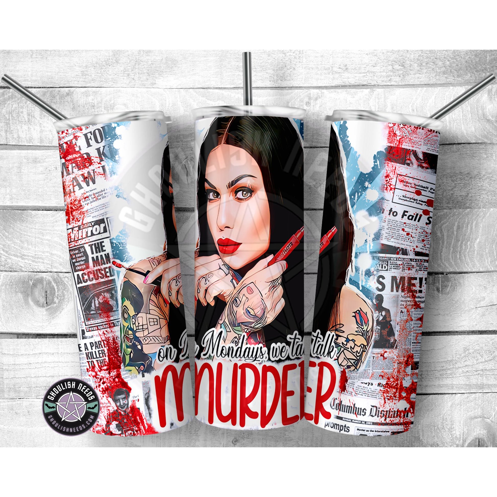 This Bailey Sarian 20oz tumbler is the perfect gift for horror and mystery fans. Crafted by hand and inspired by Youtube creator Bailey Sarian, this tumbler features her signature designs "Murder, Mystery, and Makeup". Enjoy your favorite beverage and show off your favorite creator!