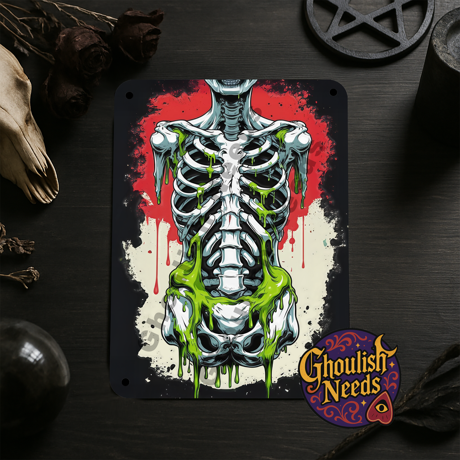 Bring a touch of the macabre to your walls with this Skeleton with Green Ooze Metal Sign. Hand-pressed on durable metal, this 8x12 inch sign oozes gothic charm with its eerie skeletal design and dripping neon slime. Perfect for horror lovers, Halloween décor, or anyone who thrives in the strange and unusual. Hang it in your crypt, office, or art wall to let everyone know you’ve got a taste for the creepy and the bold.