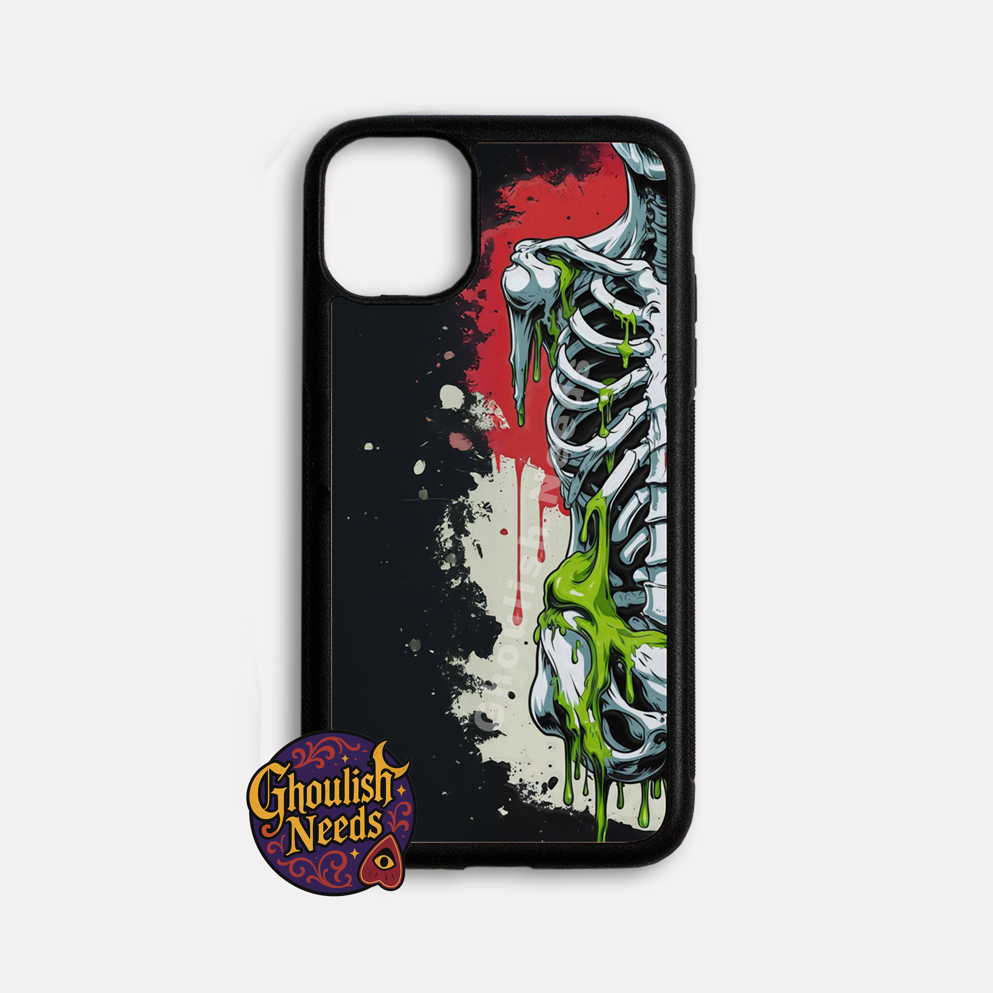 Unleash your dark side with the Bio Hazard Phone Case. Featuring a skeletal chest dripping with neon green ooze, this hand-pressed design is perfect for horror fans, gothic souls, and anyone who thrives in the strange and unusual.