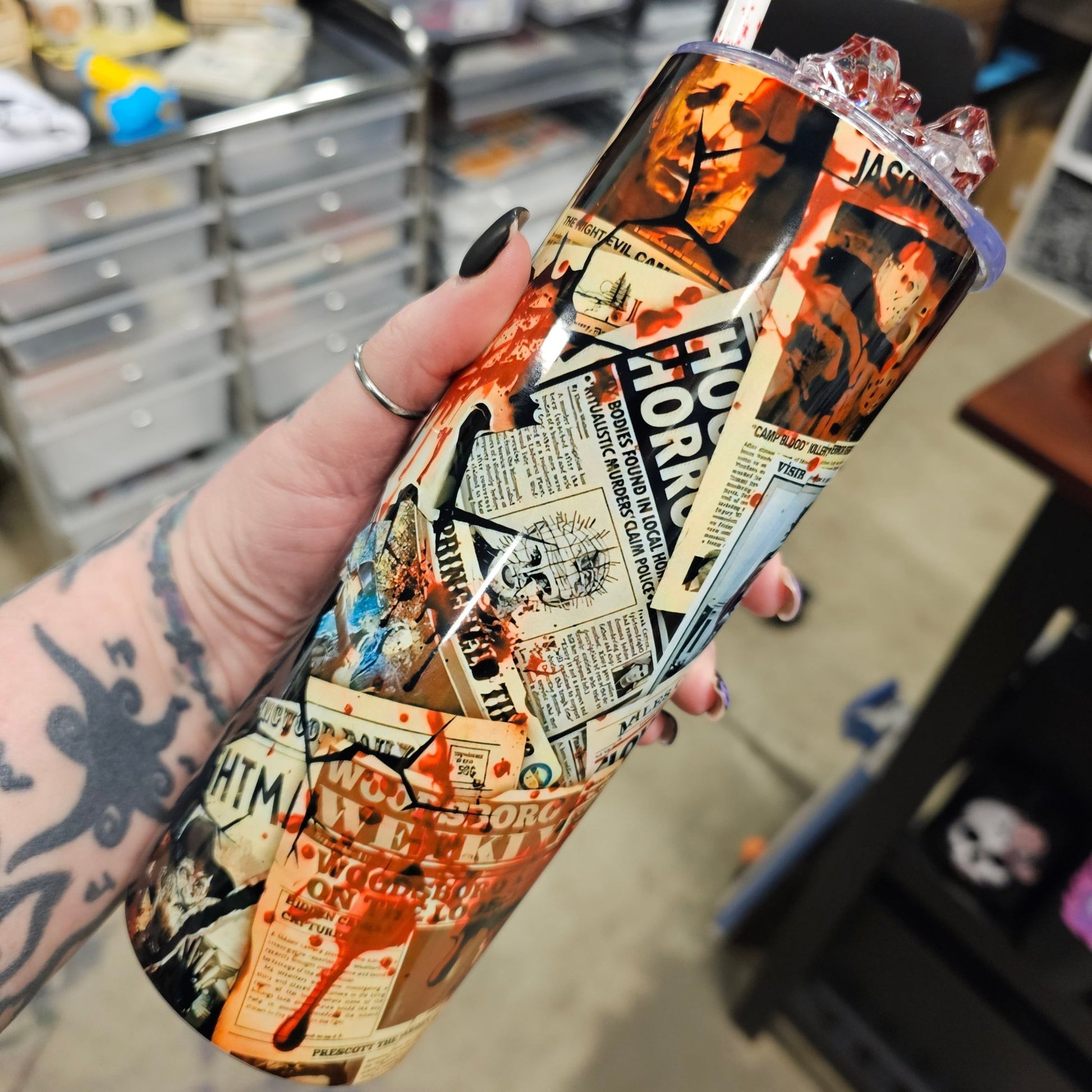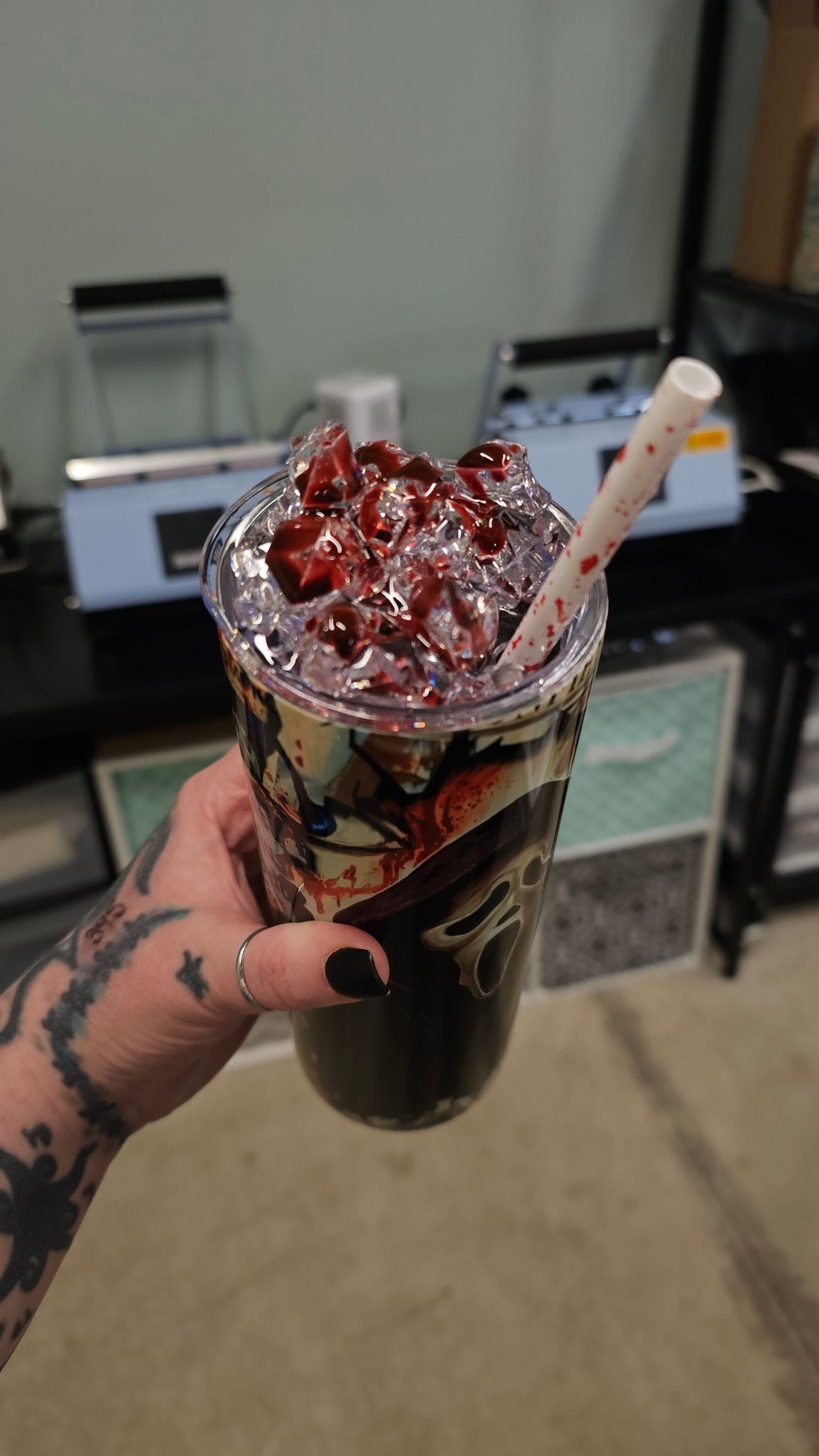 This handmade double-insulated tumbler is inspired by ghost face, Halloween horrors, and movie killers. Its bloody ice design adds a chilling touch of gothic glamour. Perfect for horror movie fans.