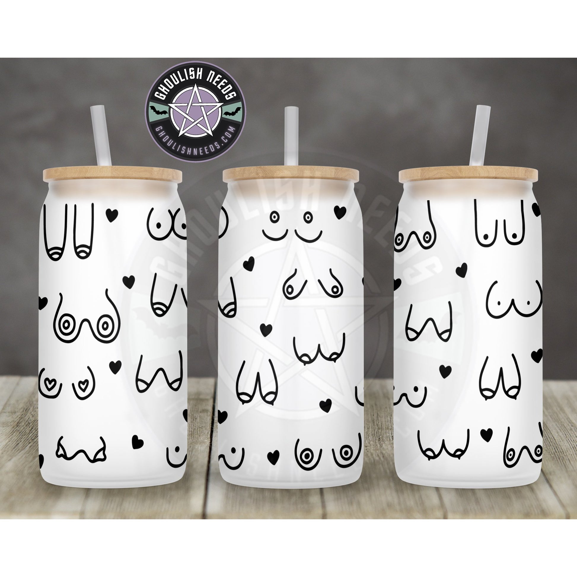 Boobies come in all shapes and sizes. This class libbey cup comes with a bamboo lid and reusable straw.