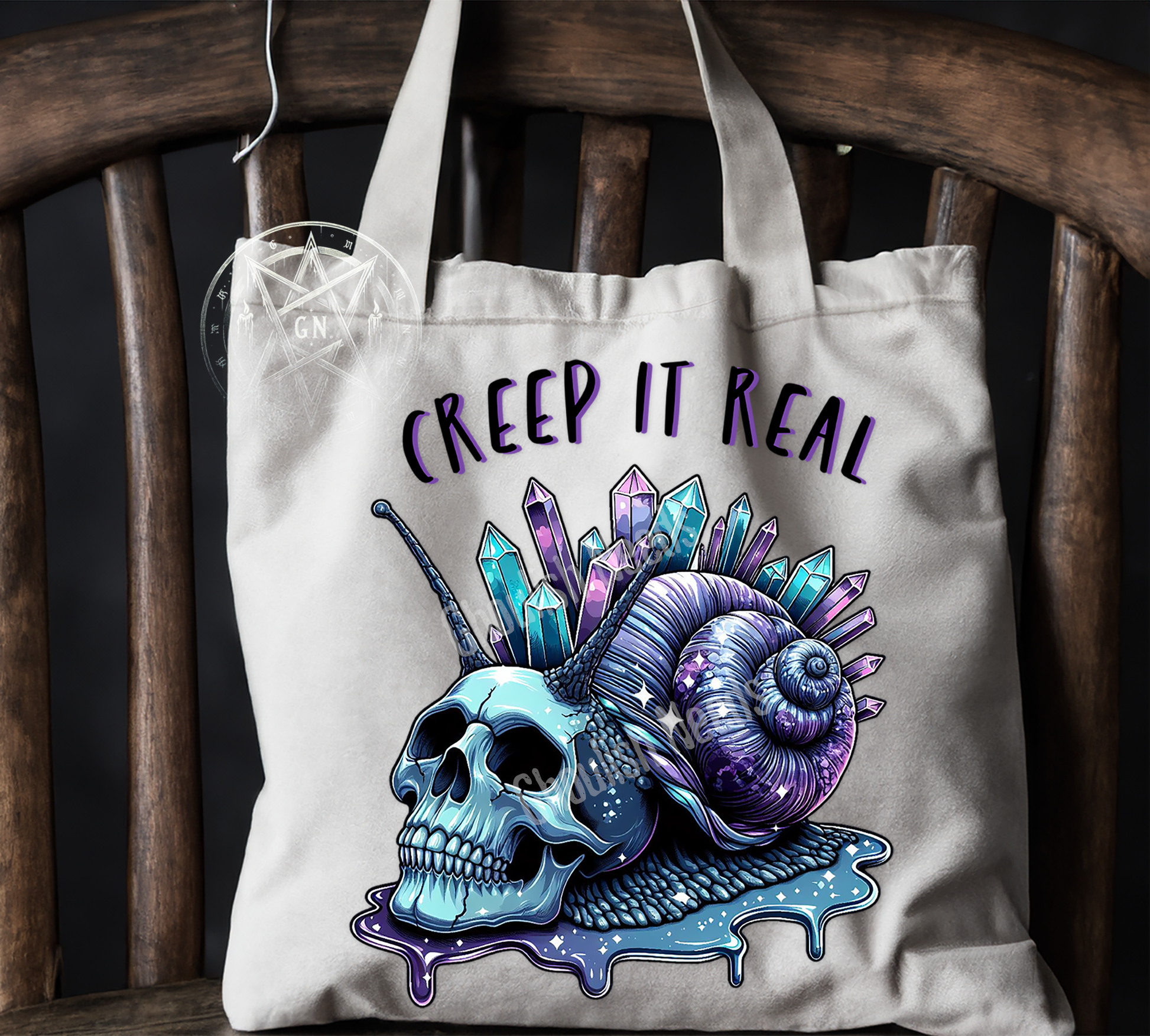 Get groovy with our Creep it Real Tote Bag! Carry your belongings in style with our handmade design featuring a crystal death snail. Durable and cool, this tote bag is perfect for any occasion. So don't just "snail" your outfit, make a statement with our tote bag!