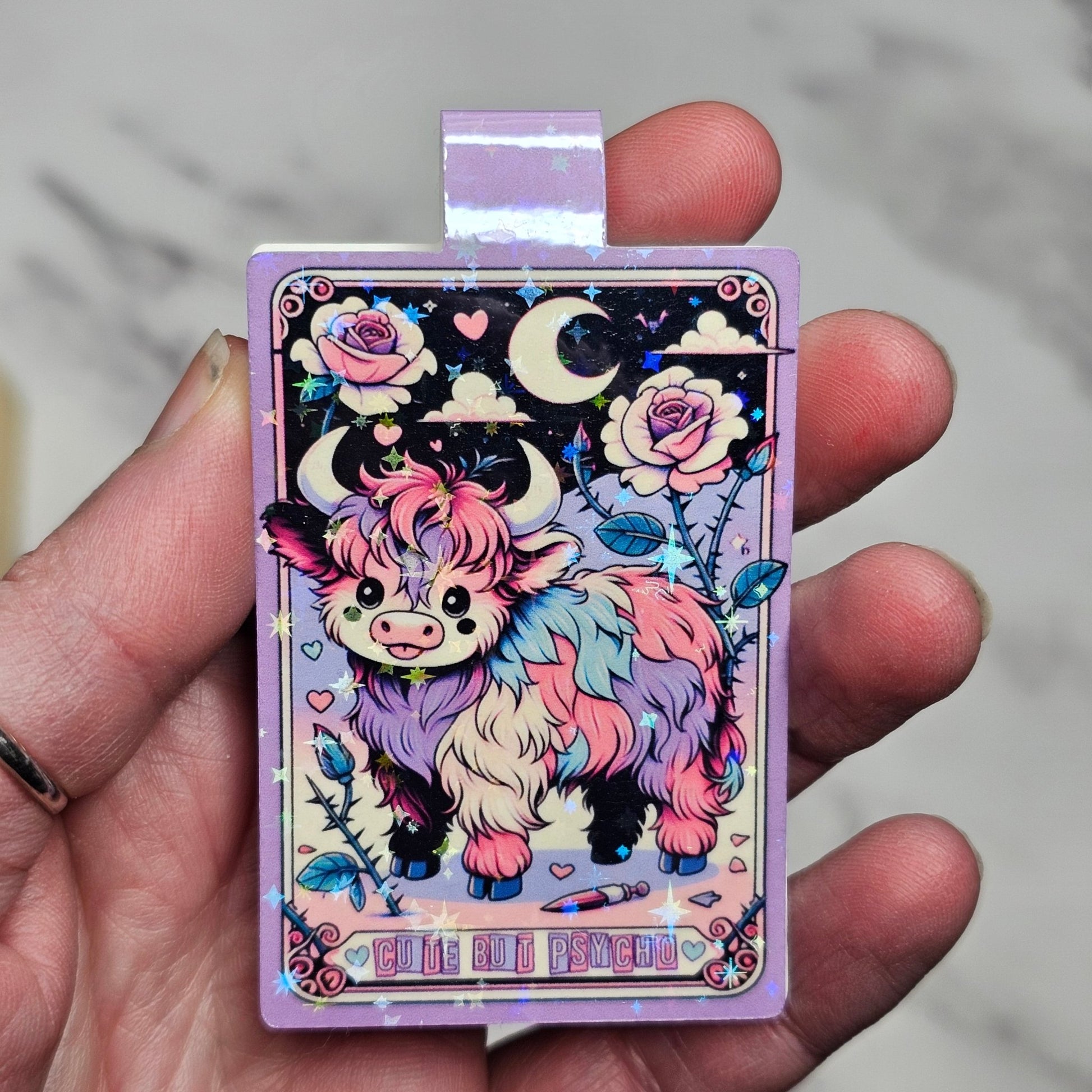 Add a little fun and attitude to your reading with this holographic magnetic bookmark! Featuring an adorable cow with the phrase "Cute but Psycho," this bookmark is both playful and bold. Its strong magnetic grip holds your page securely without damaging it. Perfect for book lovers who like a little personality in their reading accessories!