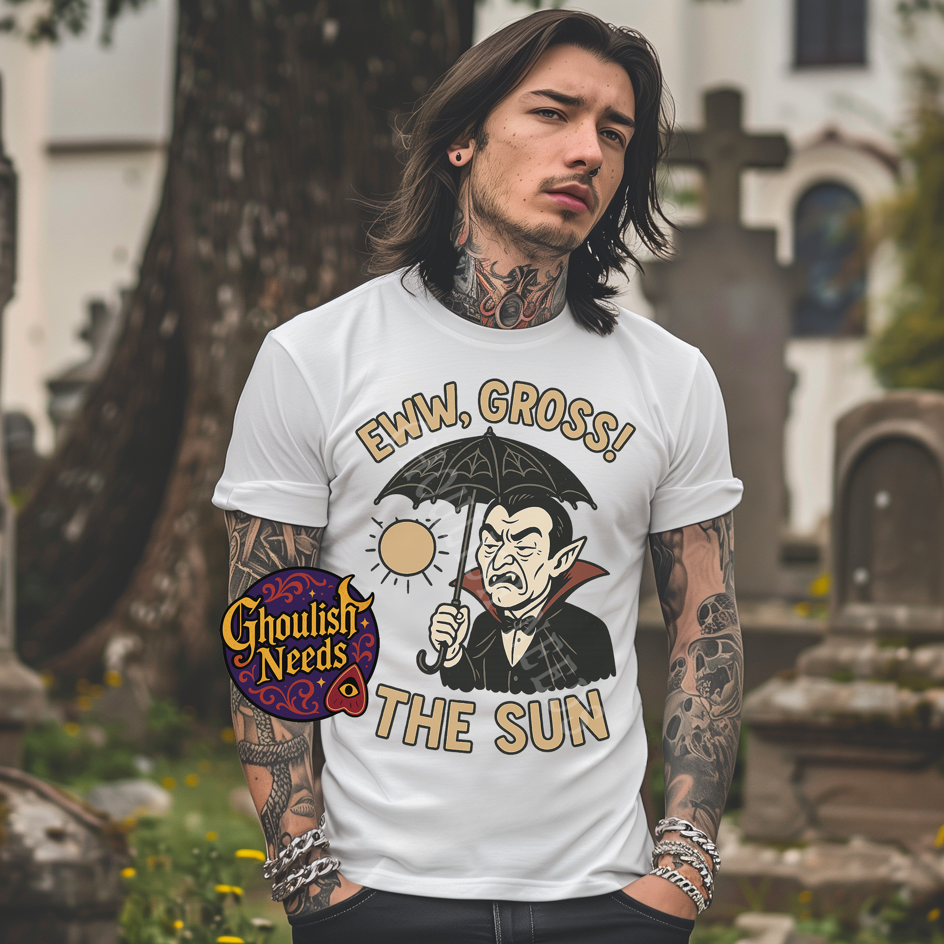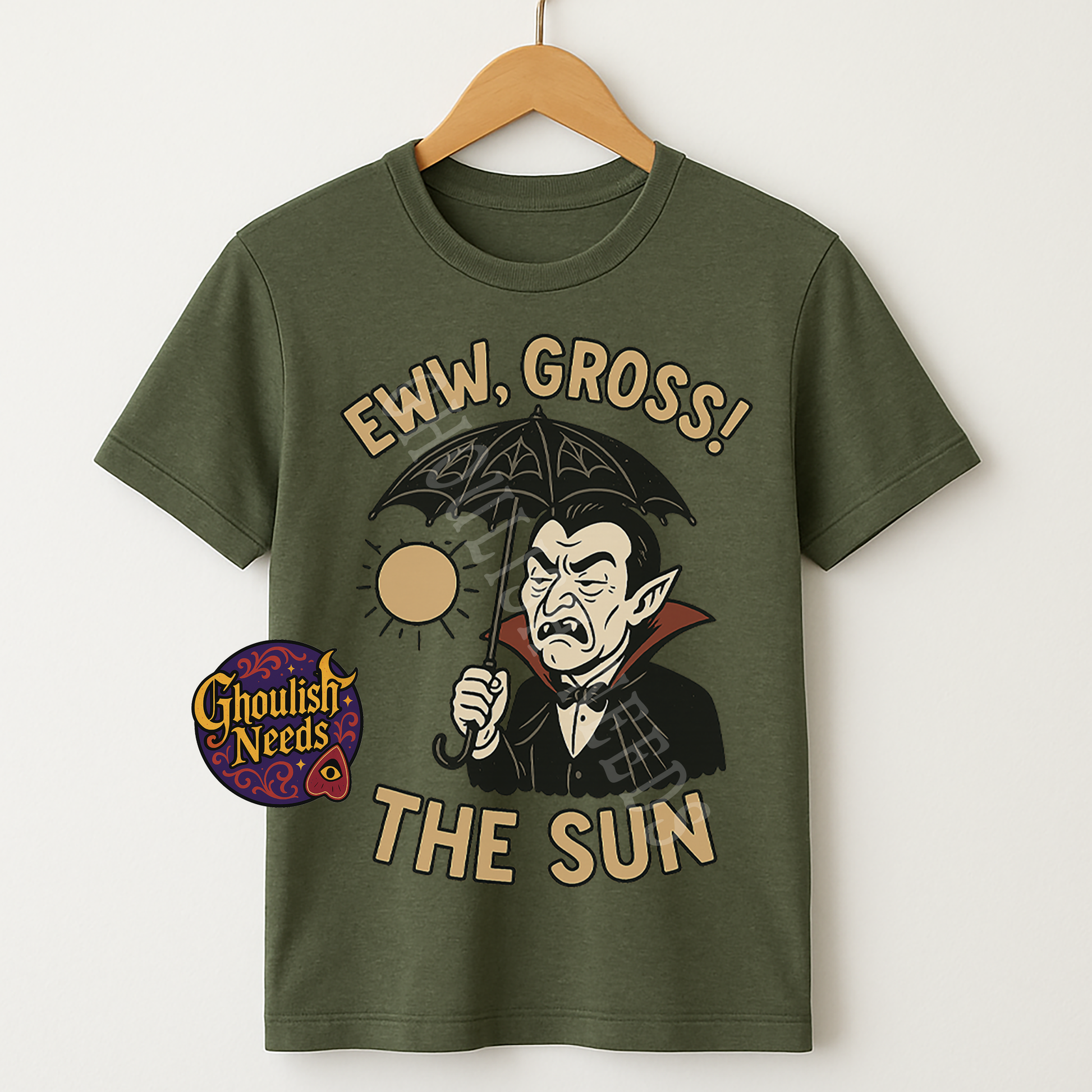 If the sun offends you on a spiritual level, this tee is for you. “Eww, Gross – The Sun” says what you’re thinking every time someone opens the blinds. It's retro, a little haunted, and soaked in sarcasm—just like you.