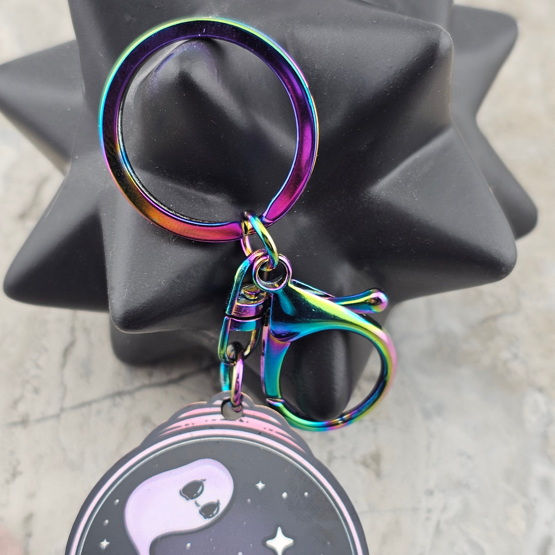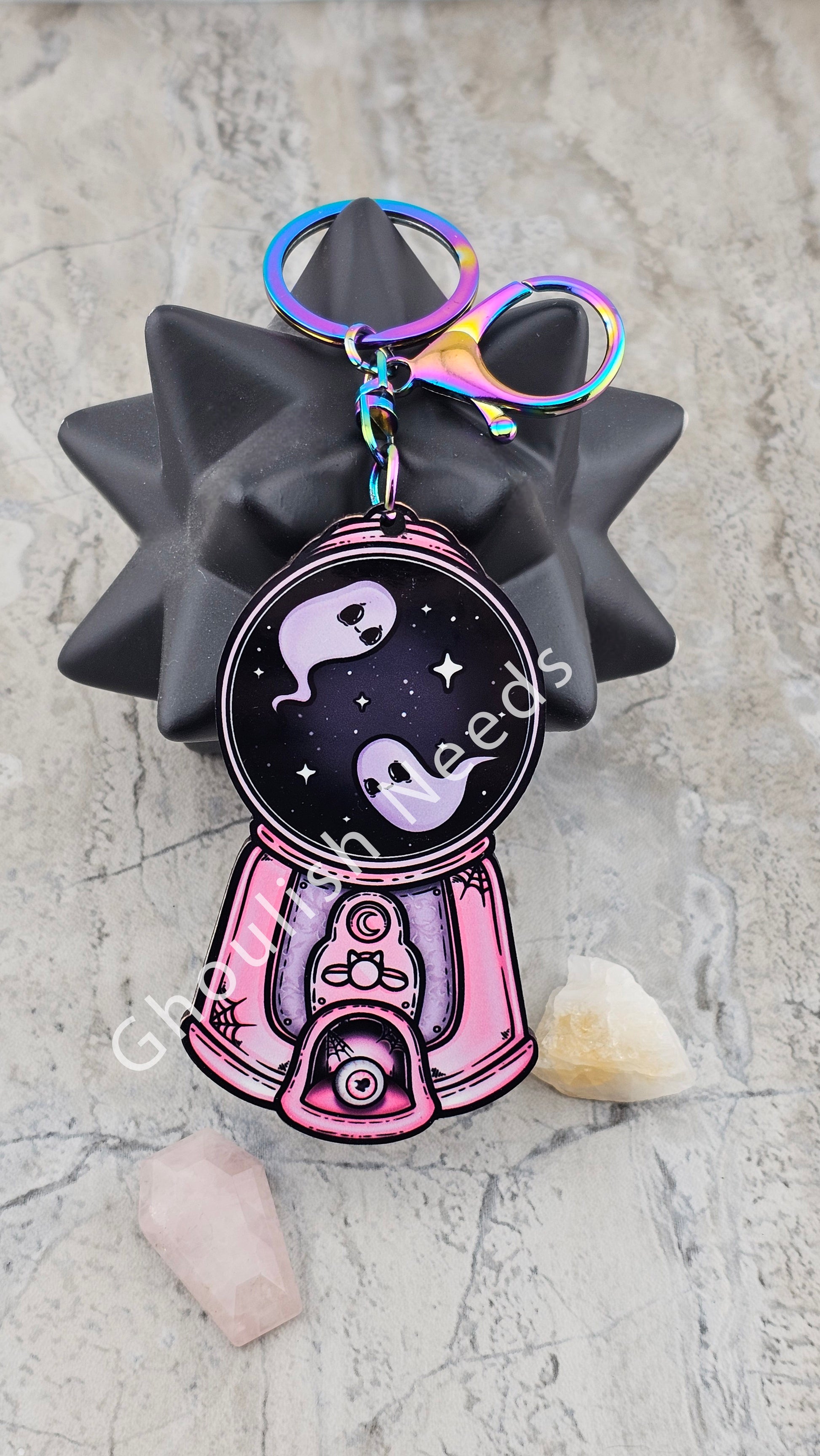 This handmade Ghostly Gumball Machine Keychain is anything but ordinary! Made from wood and featuring a unique Oil spill Rainbow metal finish, it's sure to catch the eye. The adorable ghosts and Pastel Goth design add a cute and playful touch to this quirky accessory. Spookily stylish!