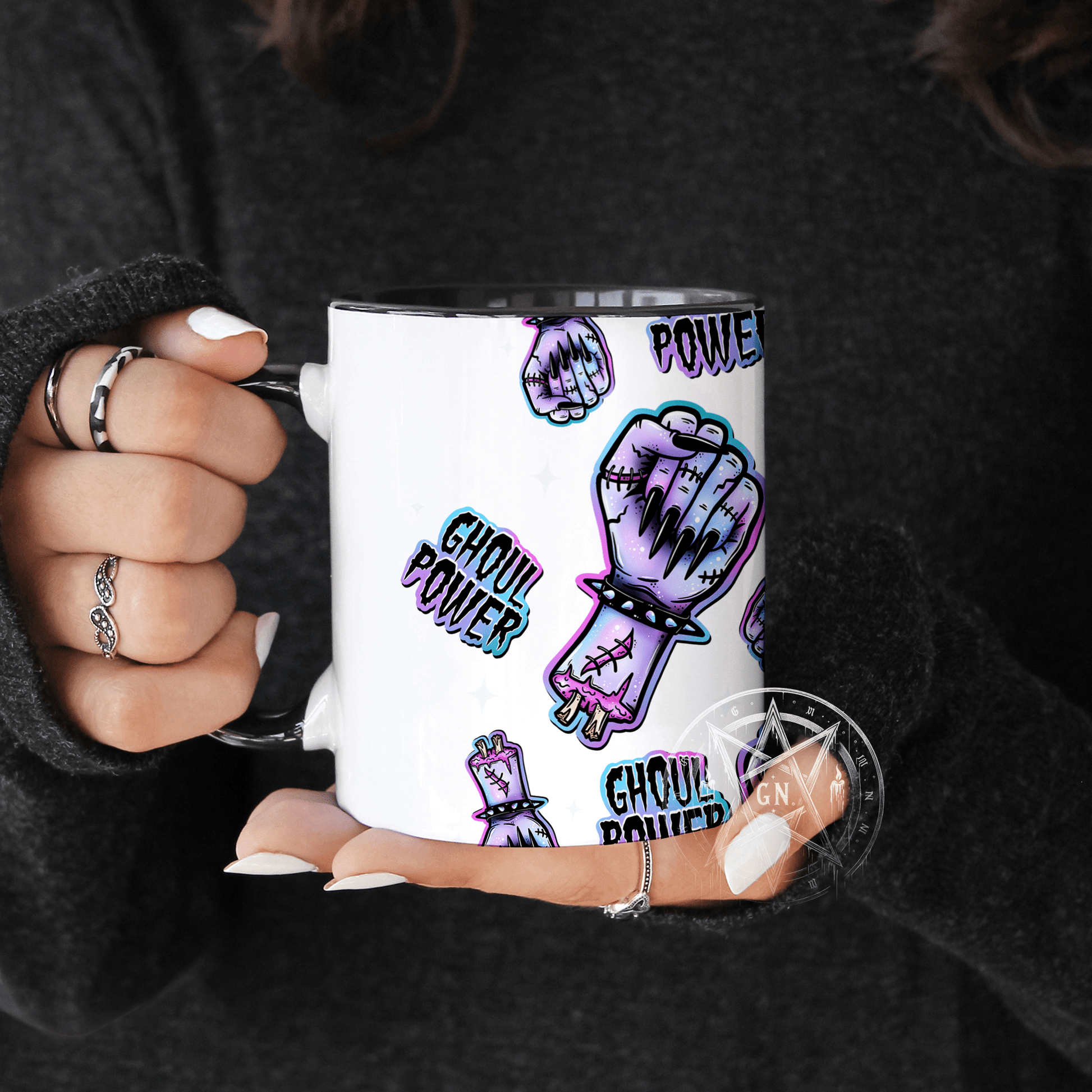 Start your day with a little eerie energy! This handmade ceramic mug features a bold Ghoul Power design with a zombie hand, set against fun pastel purple hues. The sleek black handle and interior add a touch of gothic charm. Whether you're sipping coffee, tea, or potions, this mug is as durable as it is stylish.