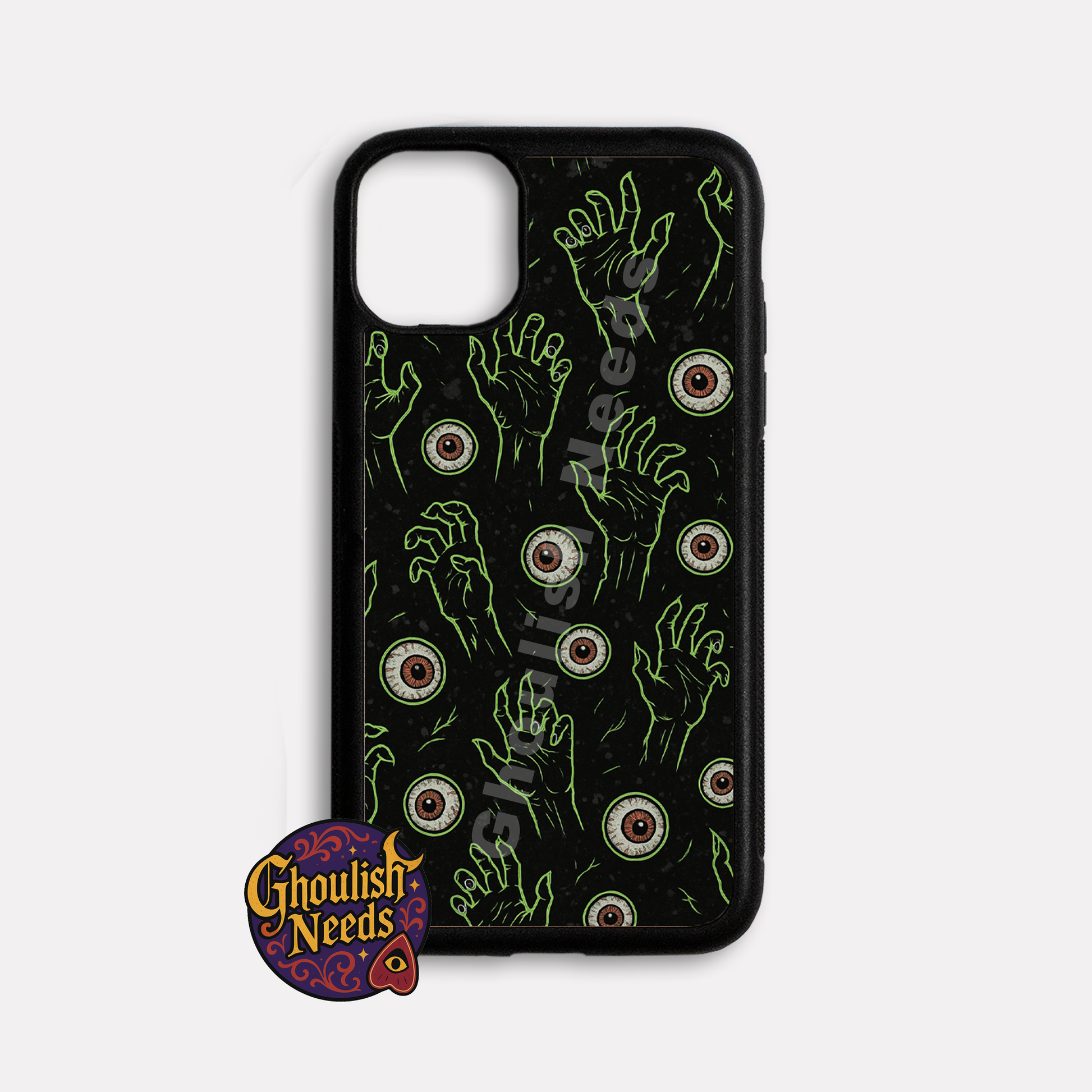 Crawling zombie hands and eerie eyeballs reach across this chilling pattern. The Ghoulies case is the ultimate accessory for horror lovers and spooky souls.
