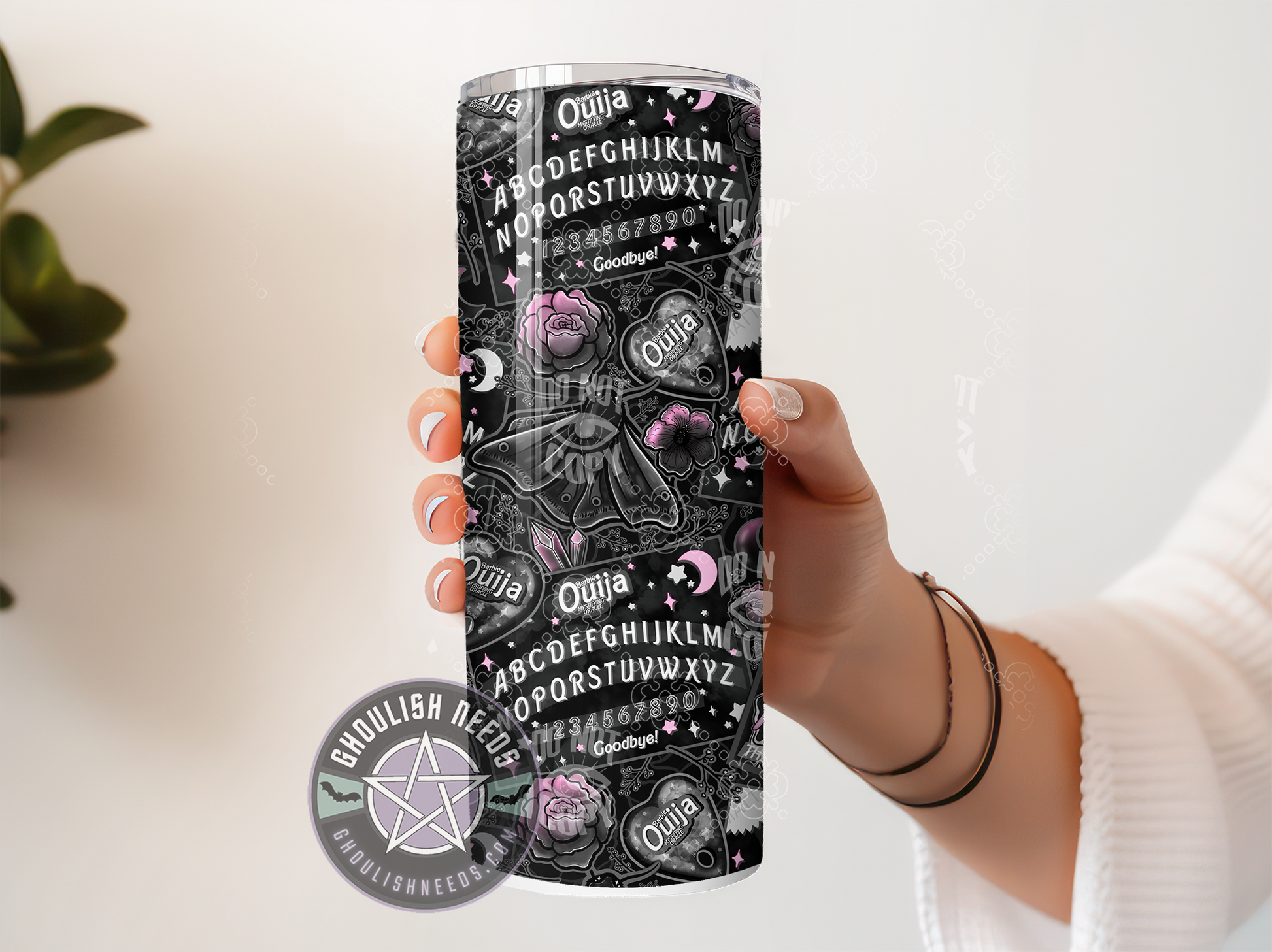Elevate your beverage game with our Gothic Barbie 20oz tumbler. Featuring a chic black and pink color scheme and a witchy Ouija board design, this tumbler will add a touch of mystique to your daily routine. Get inspired and sip in style with our Gothic Barbie tumbler!