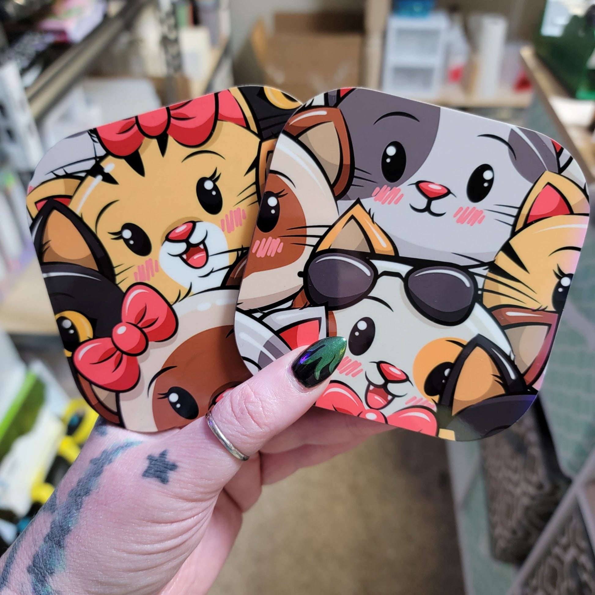 Unleash your inner cat lady (or gentleman) with our charming Happy Kitty Coasters! These handmade coasters are perfect for cat lovers, coming in a two or four pack. Made with durable hardwood, they'll last through all nine lives.
