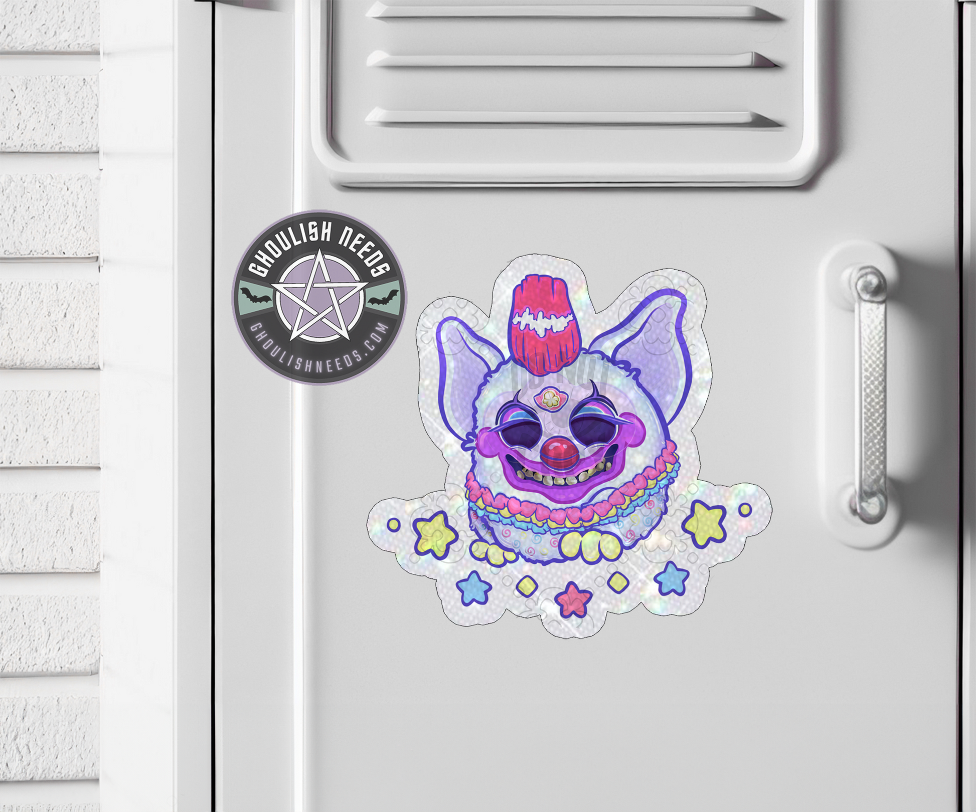 This holographic Flurby Klown Magnet is the perfect accessory for fans of the iconic 90s movie and 90s toys. Made with durable materials, it features killer klown-inspired fan art and a mesmerizing holographic design. Add some fun and quirkiness to your fridge or magnetic surfaces!