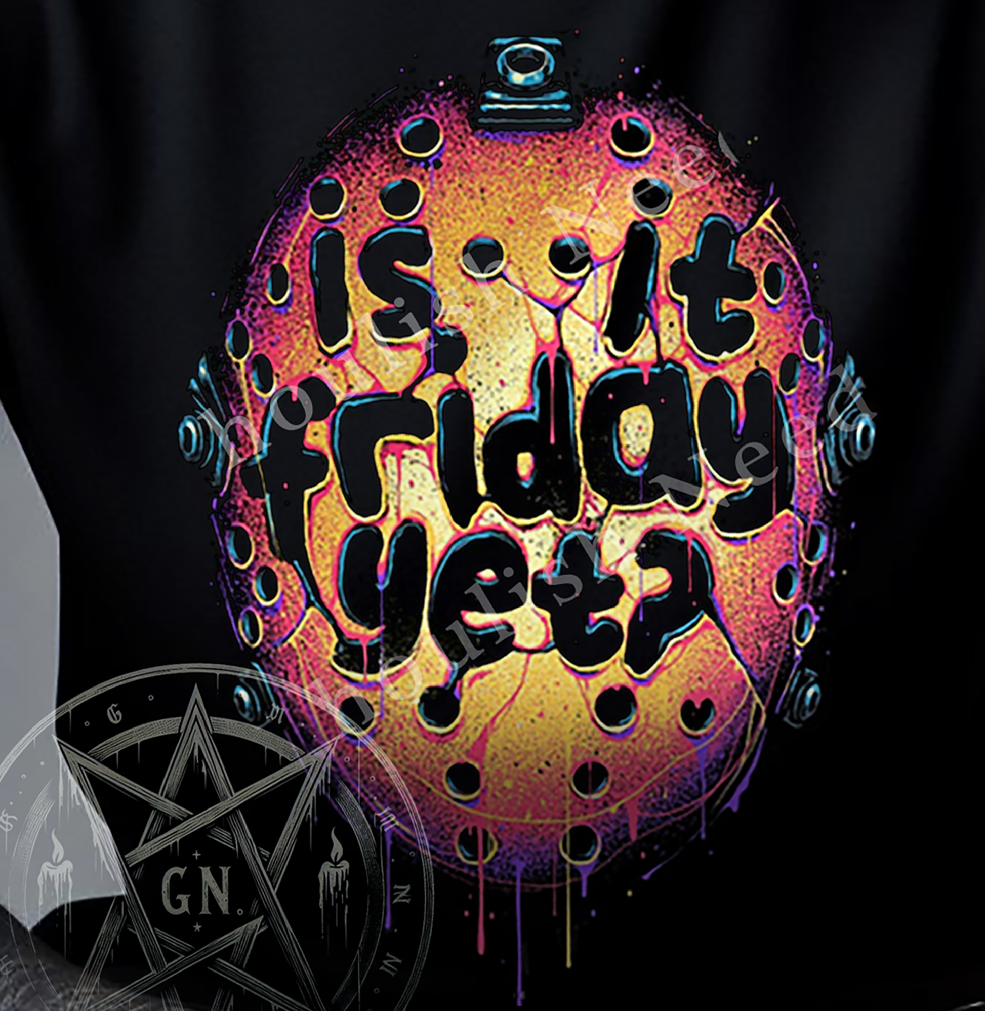 Bring a little horror humor to your wardrobe with our "Is It Friday Yet?" shirt! Featuring a fully-colored hockey mask design inspired by the legendary Jason Voorhees, this shirt is perfect for horror fans who are counting down the days 'til the weekend—or a spooky night out. Made from durable, comfortable material and hand-pressed with care, it's available in 7 shirt colors and 2 print color options to fit your unique style. Whether you're stalking through the woods (or just stalking the workweek), this tee will keep you looking killer.