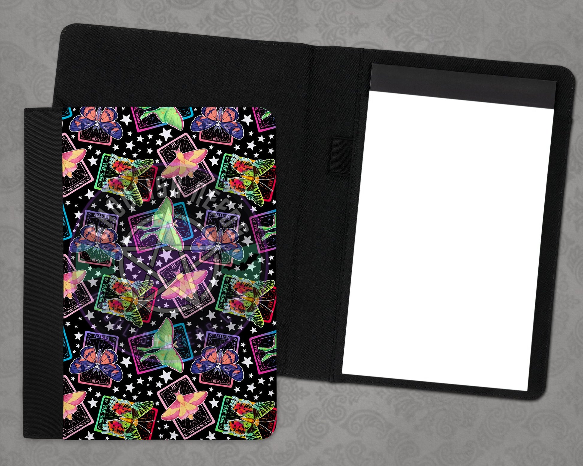 This handmade notepad holder features a beautiful Moth Tarot Mix design and comes with a notepad included. Its vibrant colors and unique design make it an eye-catching accessory for any workspace.