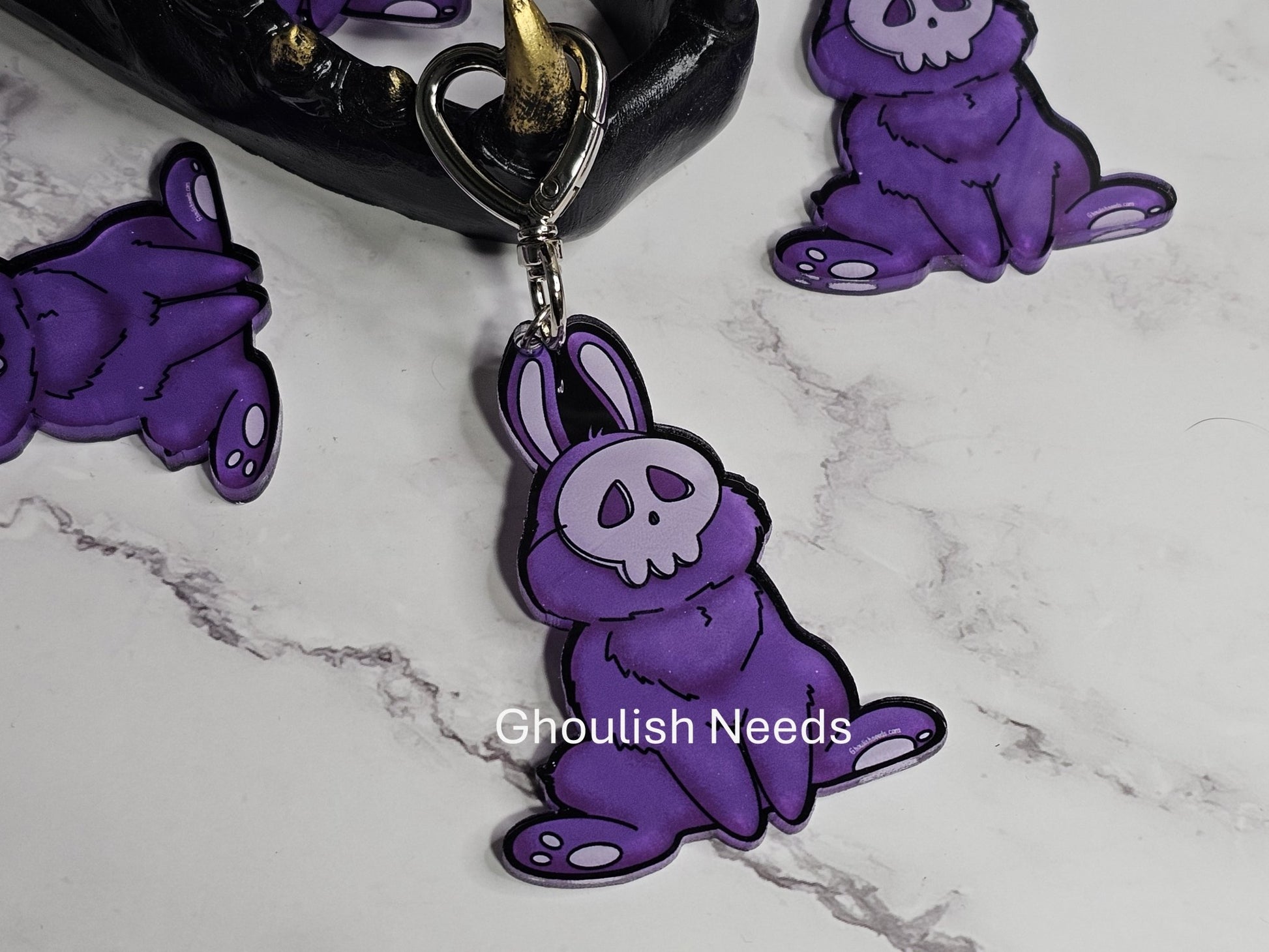 Add a little charm to your keys with this adorable acrylic keychain! 🌙💜 Featuring a mysterious purple bunny with a mask, this keychain is machine-cut for precision and hand-pressed for quality. Complete with a cute heart-clasped metal keychain, it's the perfect spooky-cute accessory for bags, keys, or lanyards!