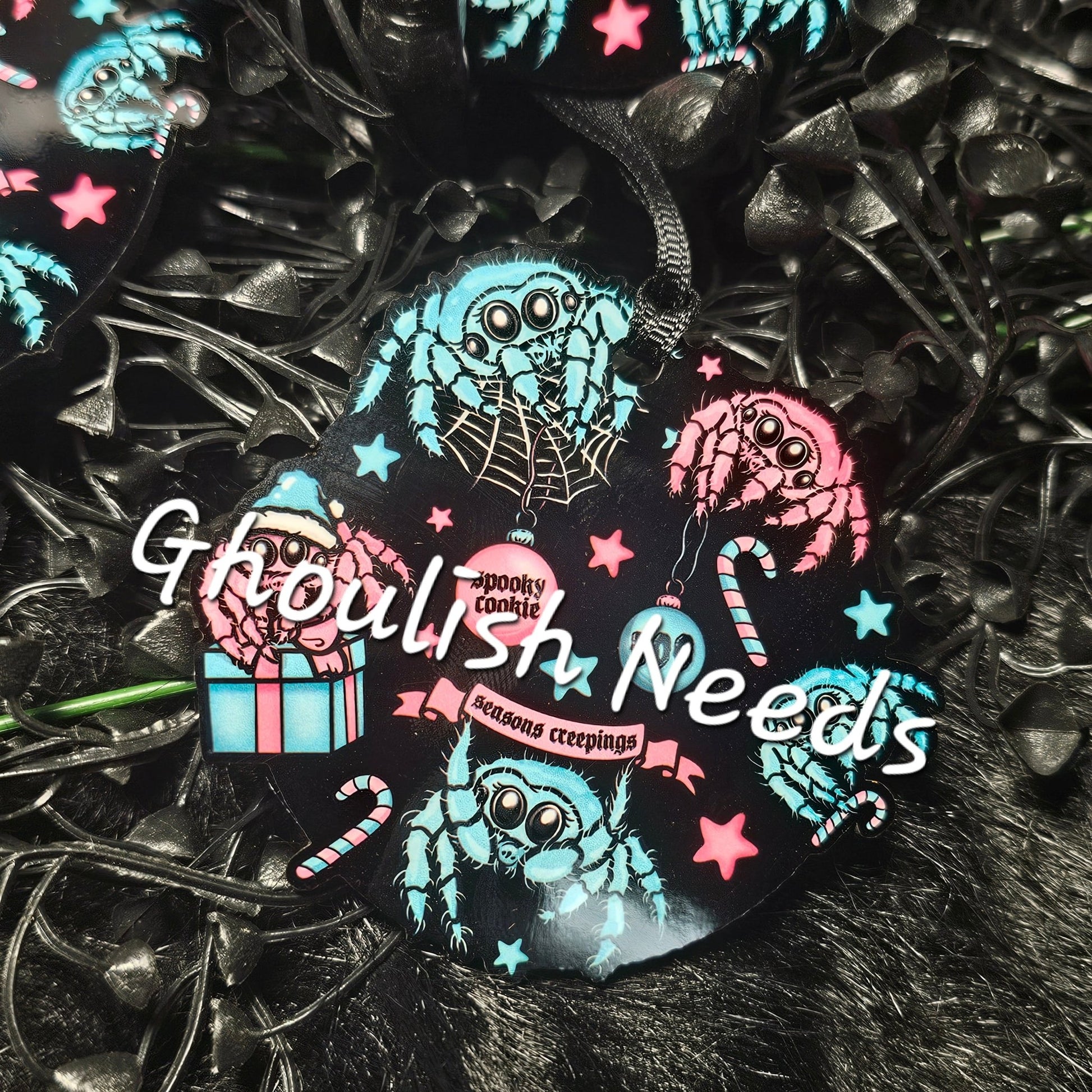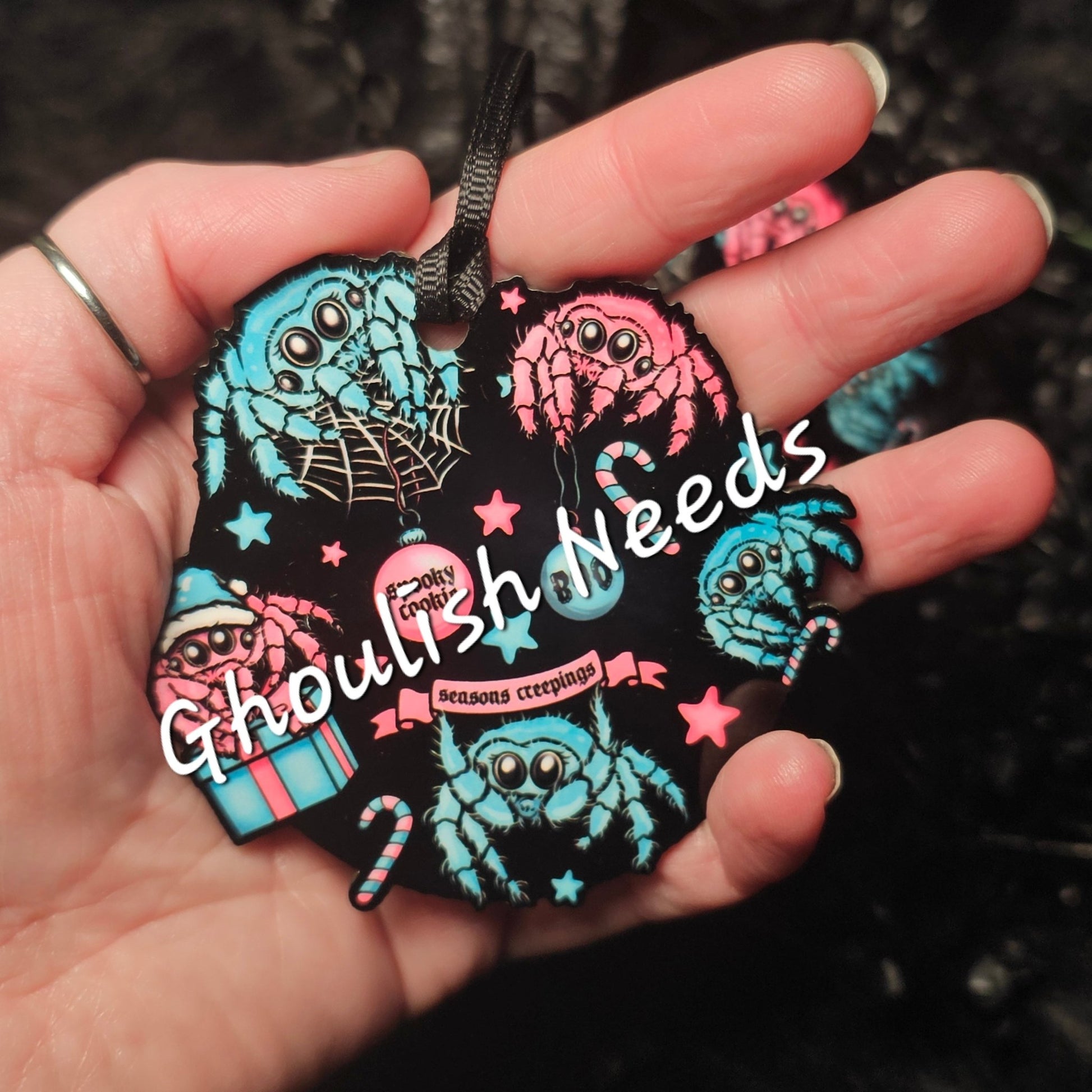 Catch the festive spirit with our Merry Jumping Spiders Ornament! This unique hexmas gift is perfect for your spooky tree or a loved one. Made from durable laser cut hardboard, it measures 3 inches round. Don't miss out on this fun and quirky addition to your holiday decor.