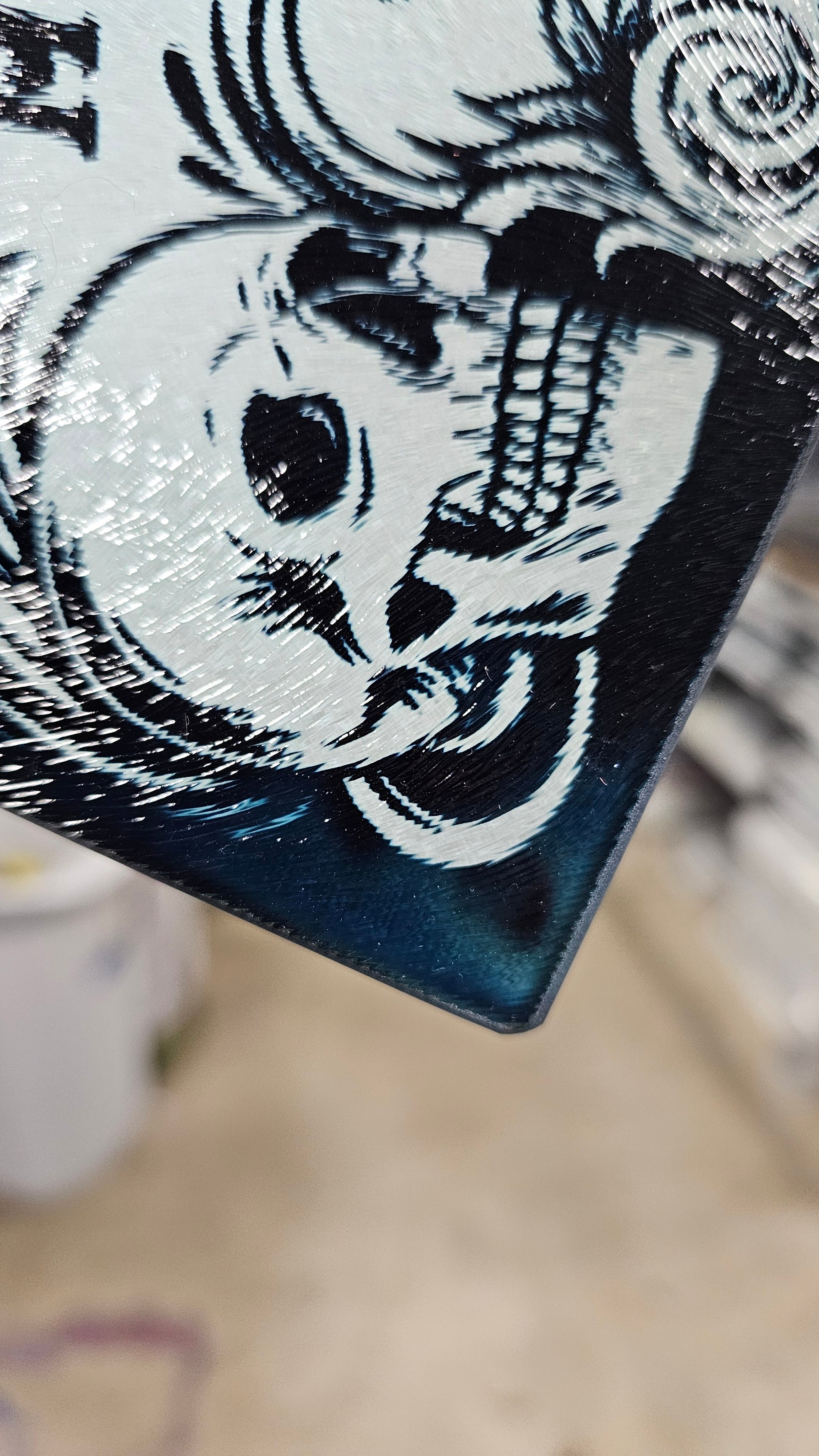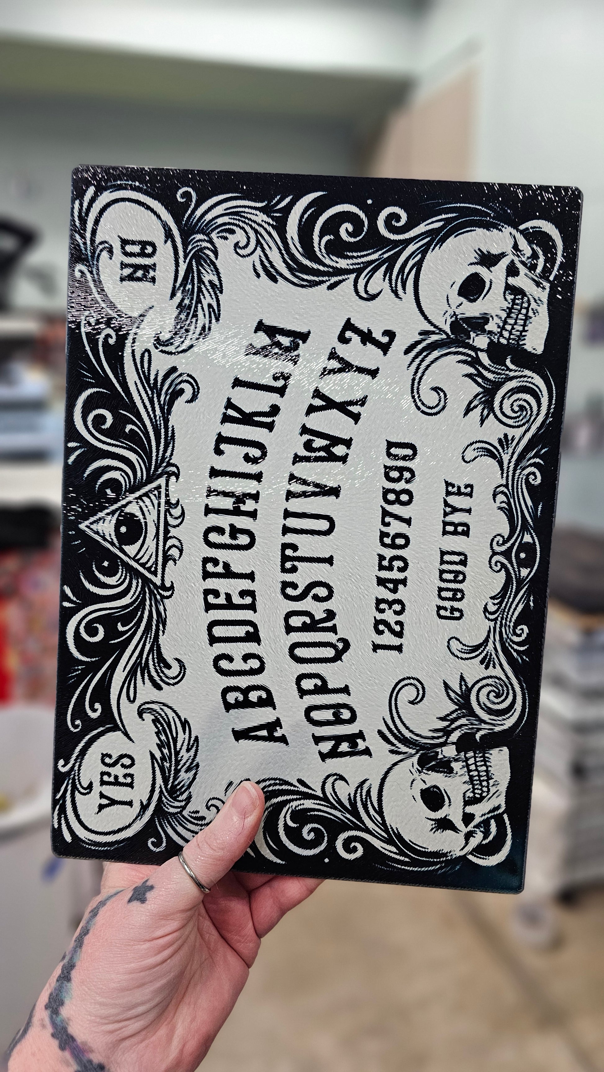 OUIJA GLASS CUTTING BOARD! THIS IS A MESS-UP, IMAGE DIDNT PRESS ALL THE WAY LEAVING SOME BLACK FADED. NO REFUNDS, ORDERS ON MESS-UPS ARE FINAL!