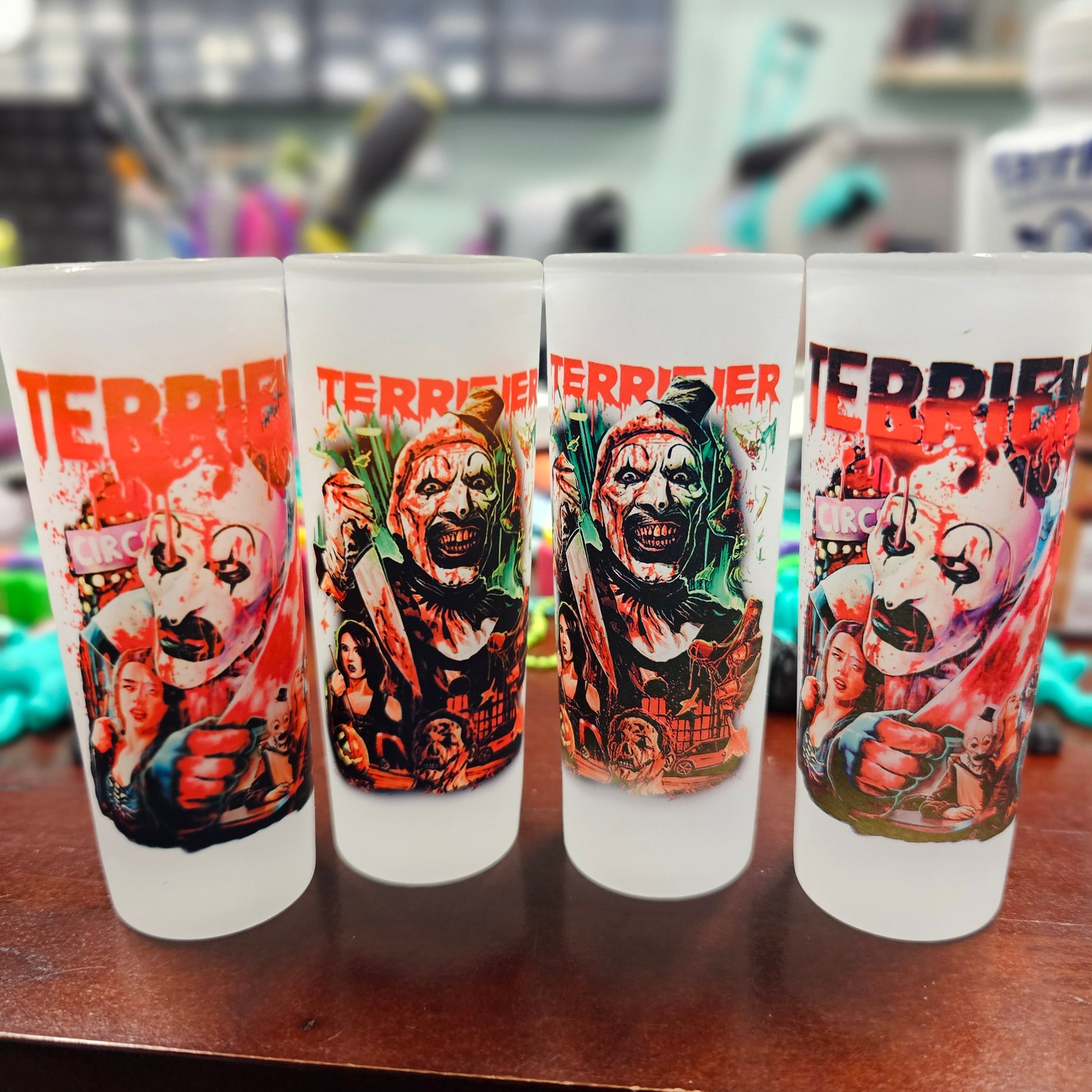 RANDOM TERRIFIER SINGLE SHOT GLASS! THIS IS A MESS-UP, IMAGE DID NOT PRESS WELL . NO REFUNDS, ORDERS ON MESS-UPS ARE FINAL!