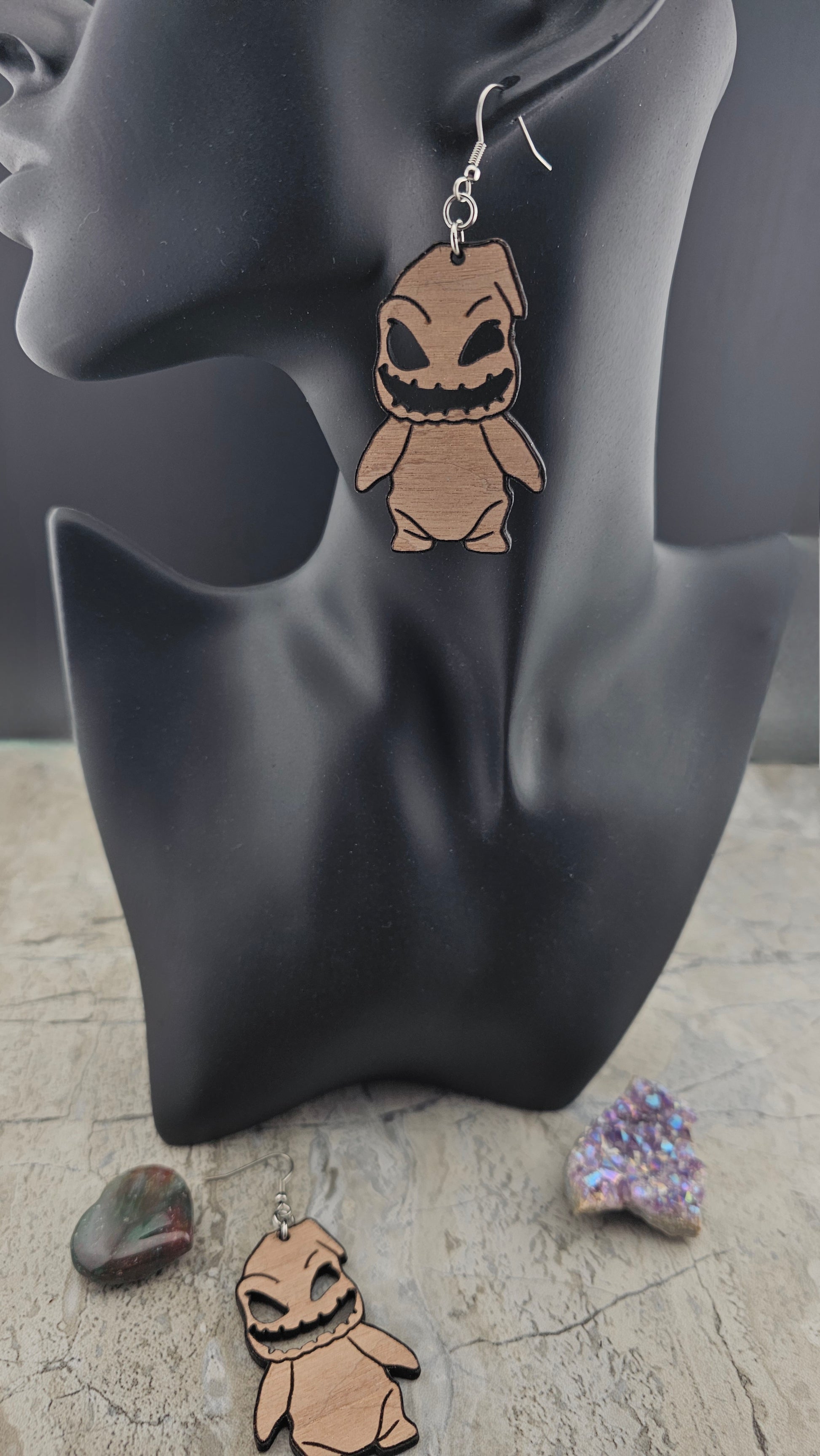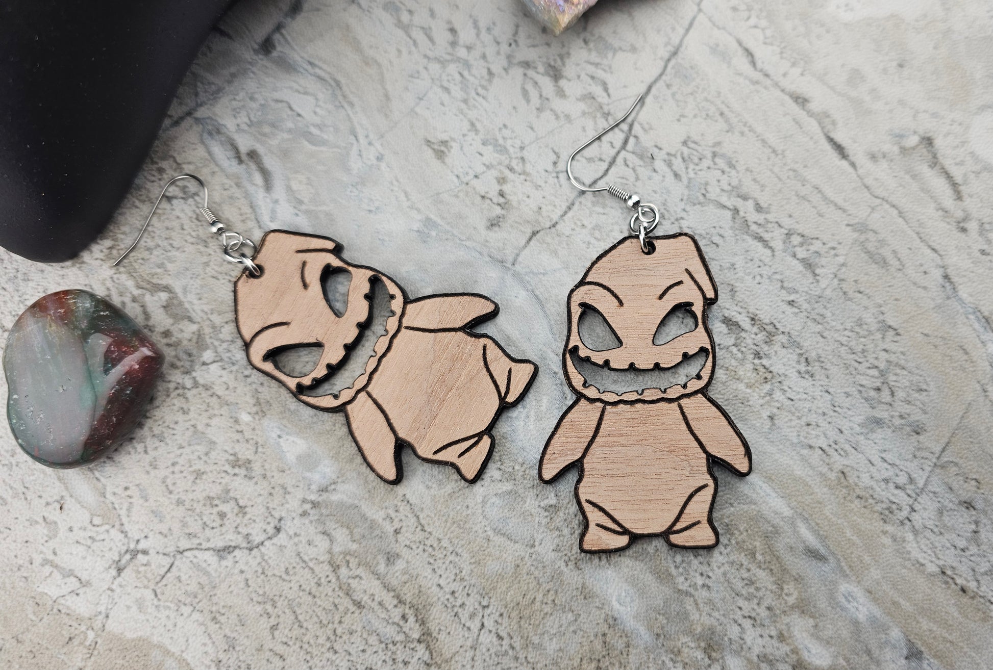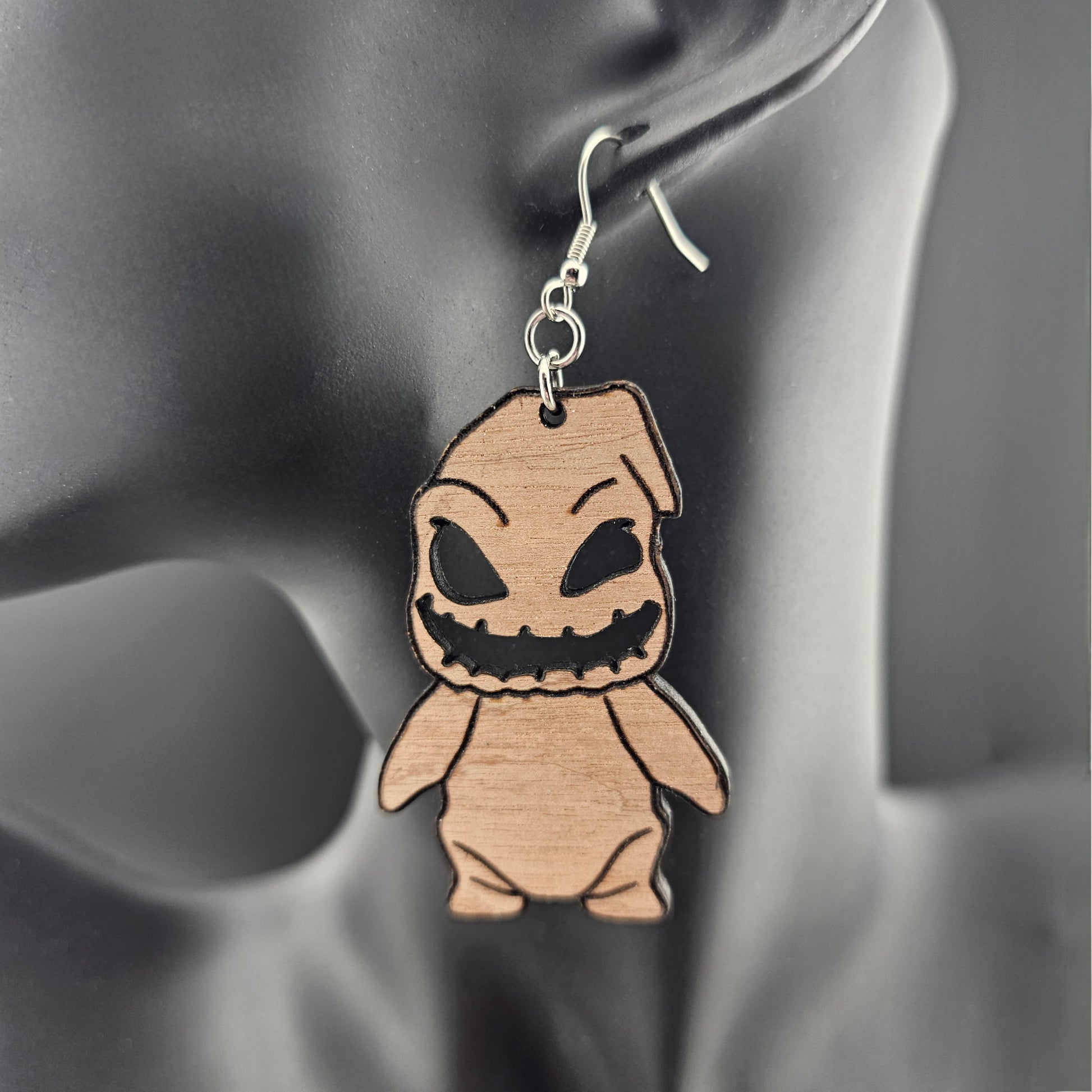 Elevate your style with these handmade Oogie inspired wood earrings! Each pair is laser engraved on Walnut plywood, giving them a unique and detailed look. Hypo-allergenic materials make them perfect for anyone to wear. Show off your love for the classic character with these statement pieces!