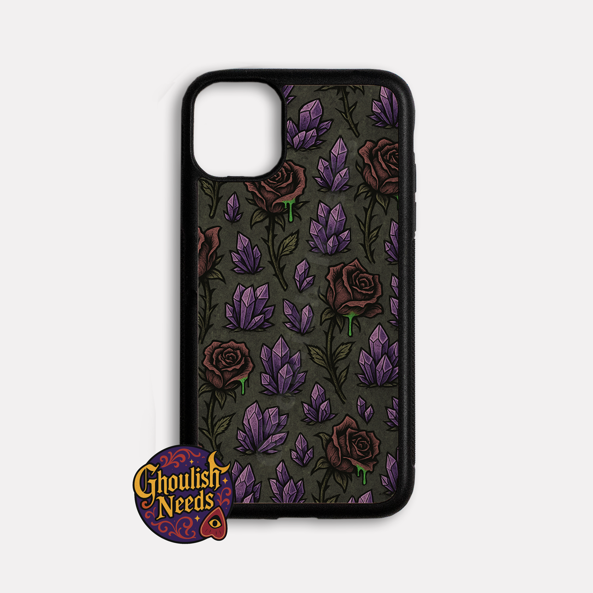 A poisonous romance blooms. The Poisoned Thorns case drips with wilted roses, eerie green liquid, and glowing purple crystals. Perfect for gothic romantics who like their beauty with a bite.