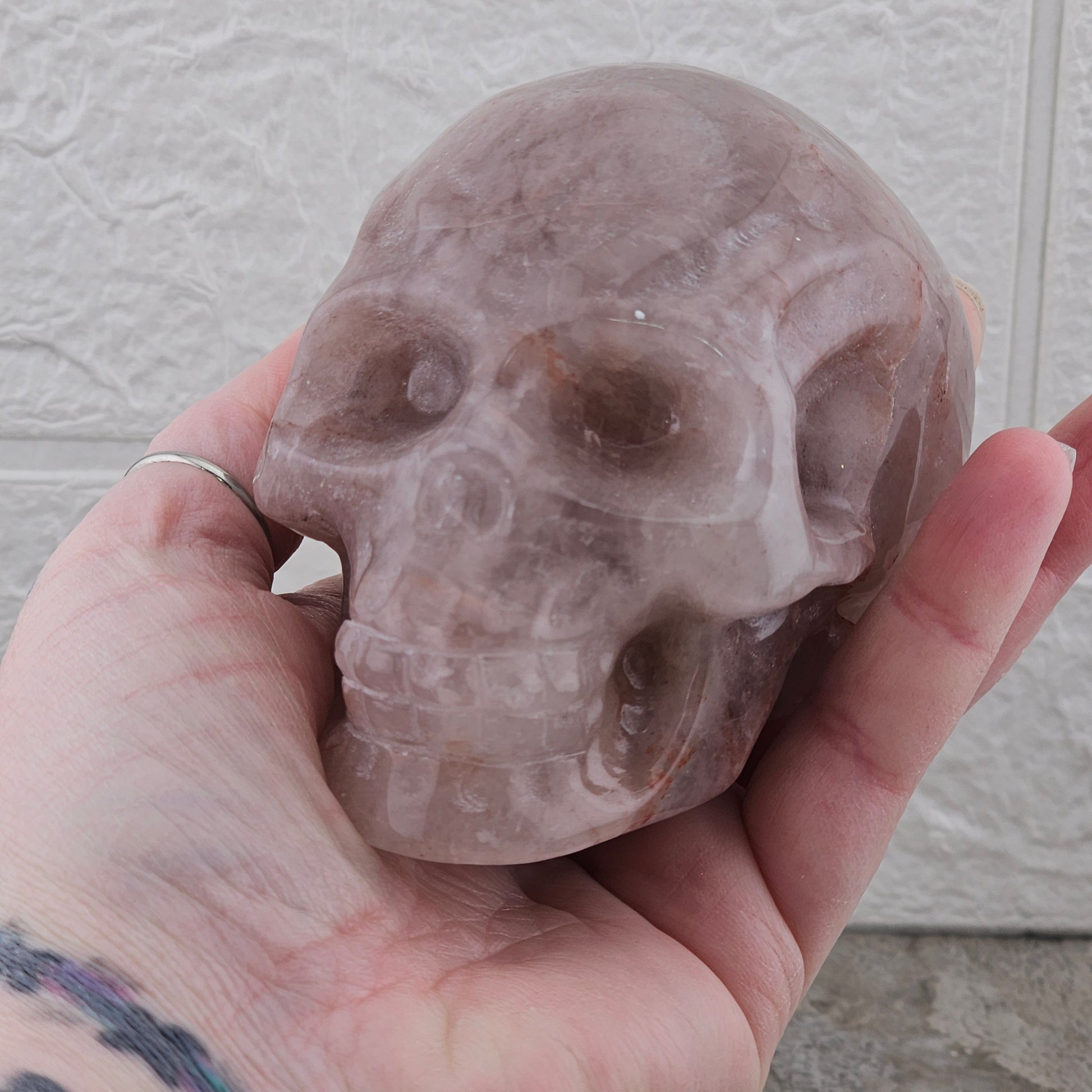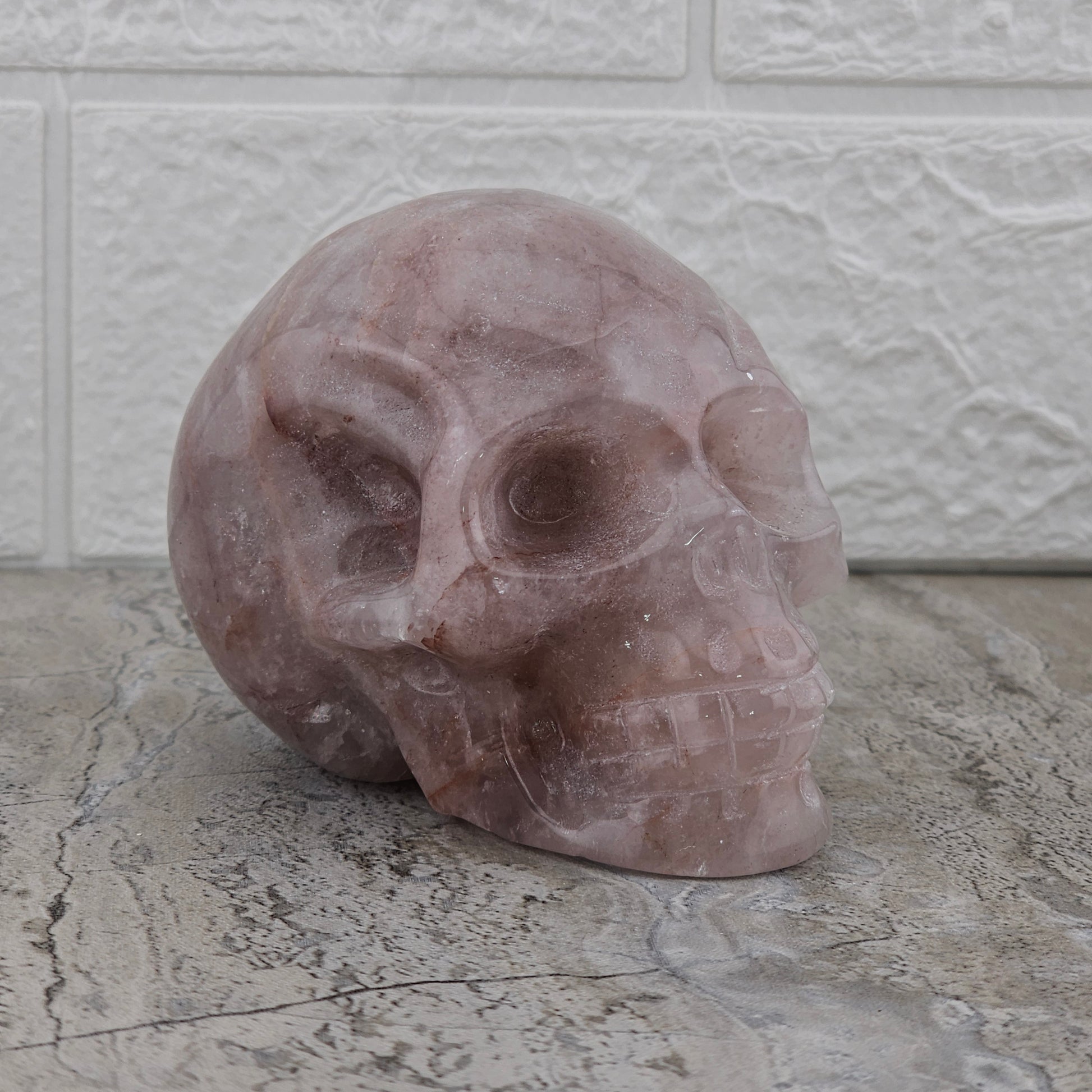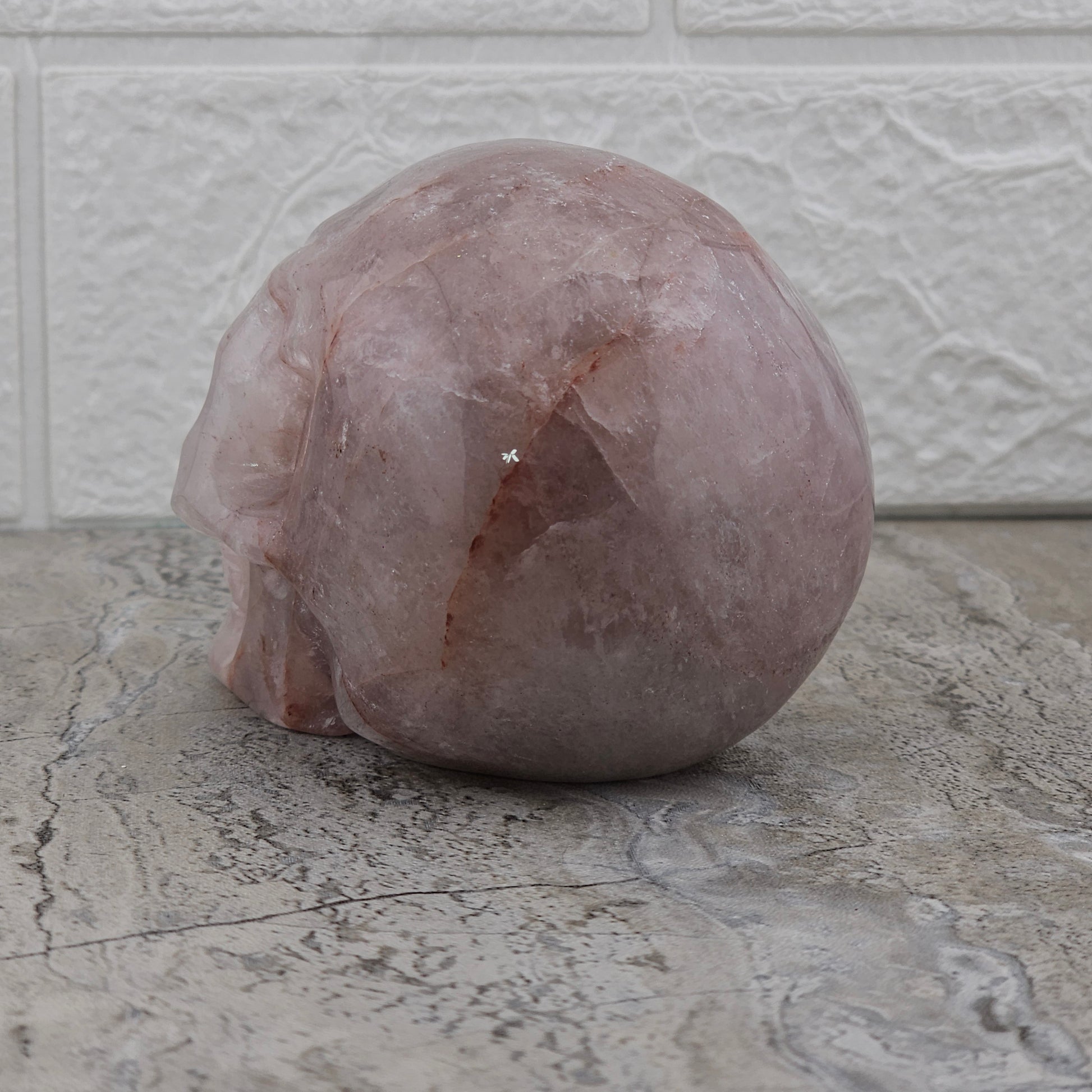Expertly carved from strawberry quartz, this skull stone carving is not only visually stunning but also durable. Weighing 21.65oz, this carving stands at 3 inches tall and 4.5 inches wide, making it the perfect addition to any collection. Experience the unique energy and natural beauty of strawberry quartz with this exquisite piece.