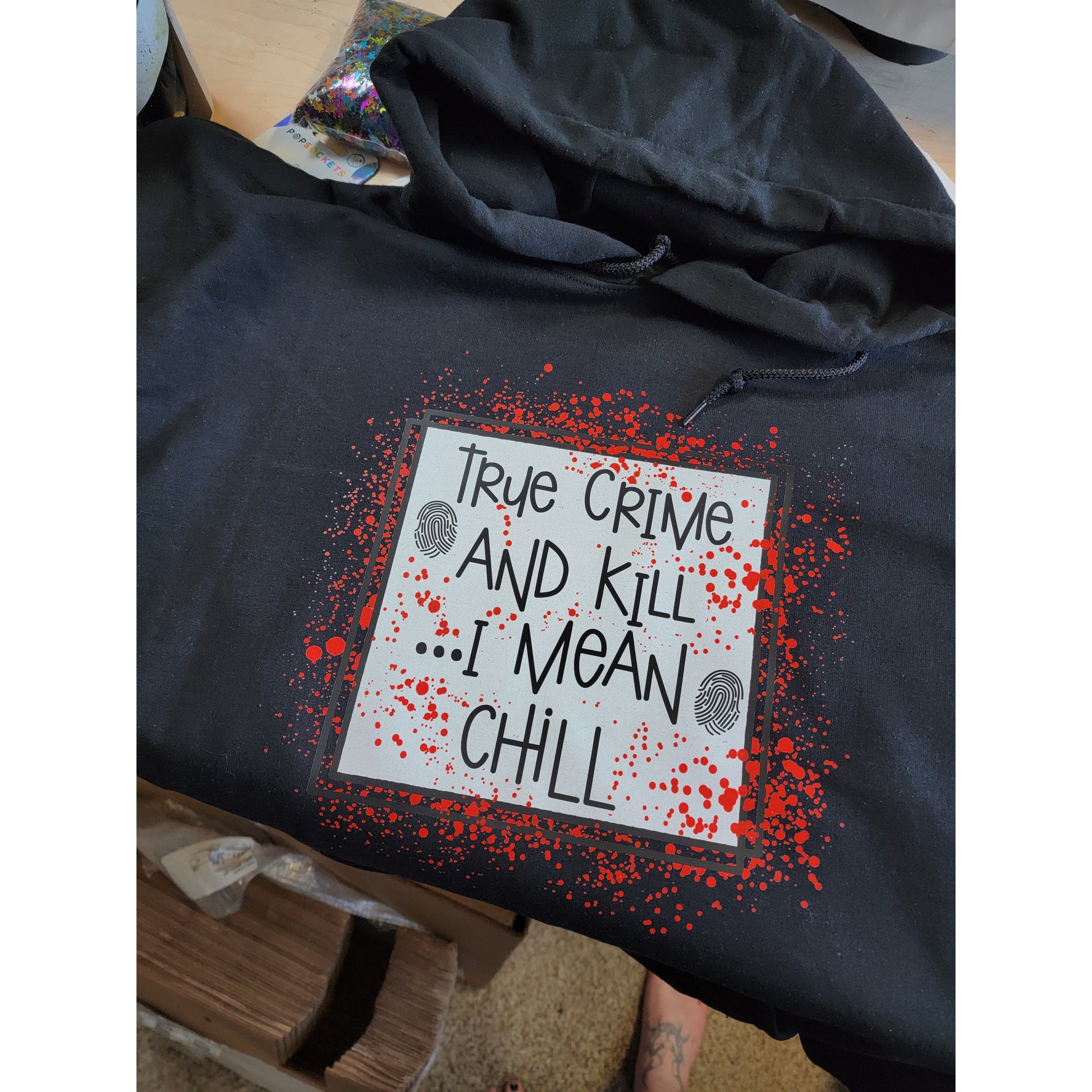 Unisex Hoodie with detailed True Crime with blood splatter graphic. Soft thickness with a semi stretched fit.