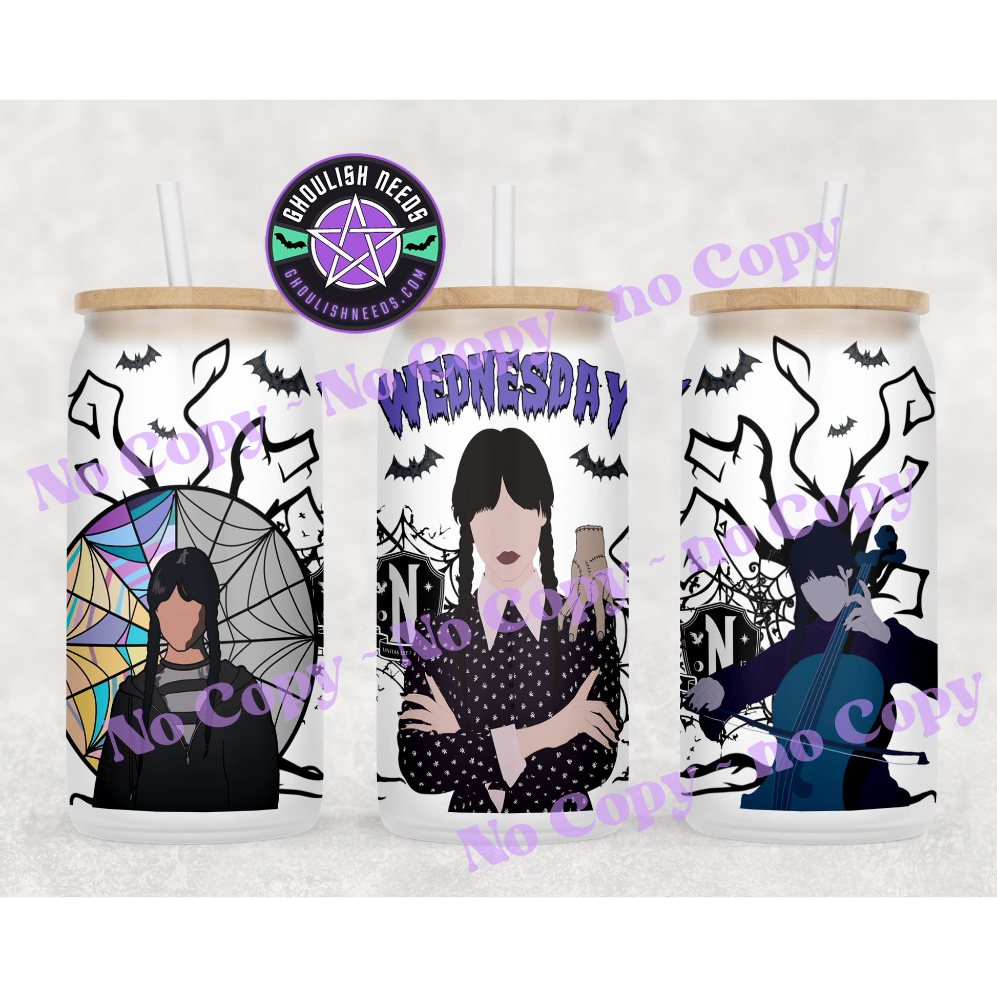 Spice up any day of the week with Wednesday's frosted glass! Enjoy your favorite cold beverage in the unique glass with a bamboo lid and reusable straw. Show off your love for the supernatural and gothic side.