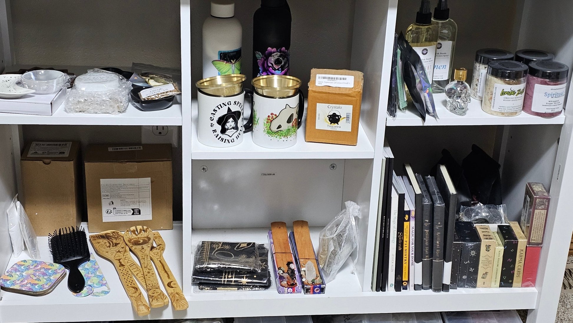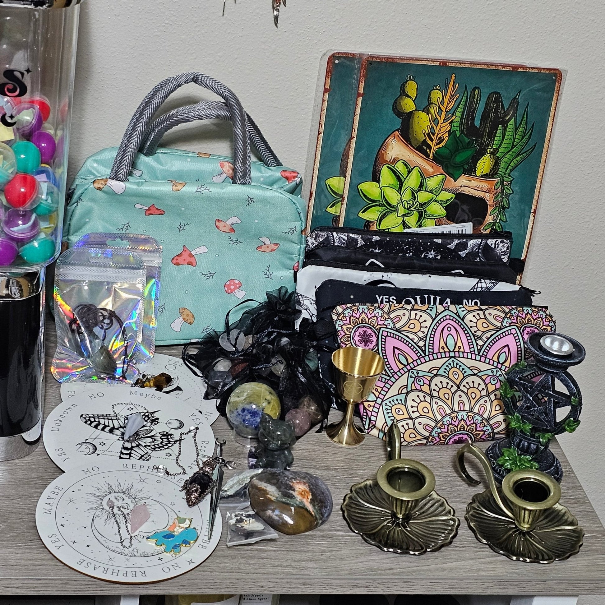 Our witches brew mix is an amazing option for those who love a surprise. Each bubble is drawn at random and inside can be a number of magical items. You can get anything from Stone towers, Stone Carvings, Pendulums, trinket dishes, wax melts, room sprays, tarot cards, Mugs, Jewelry, Herbs, Diffusers, Signs and so much more. We are adding more items daily to what you could get.